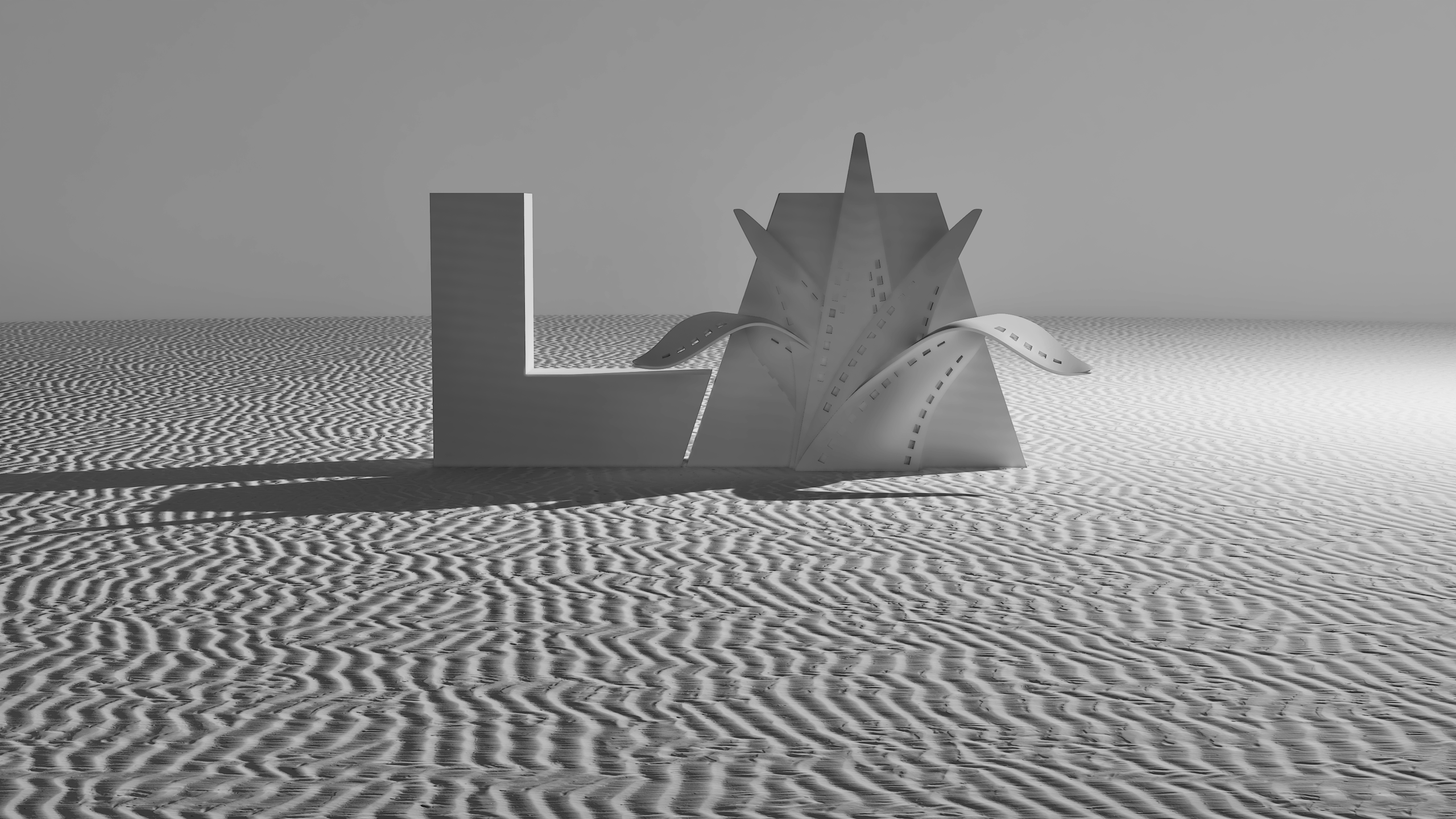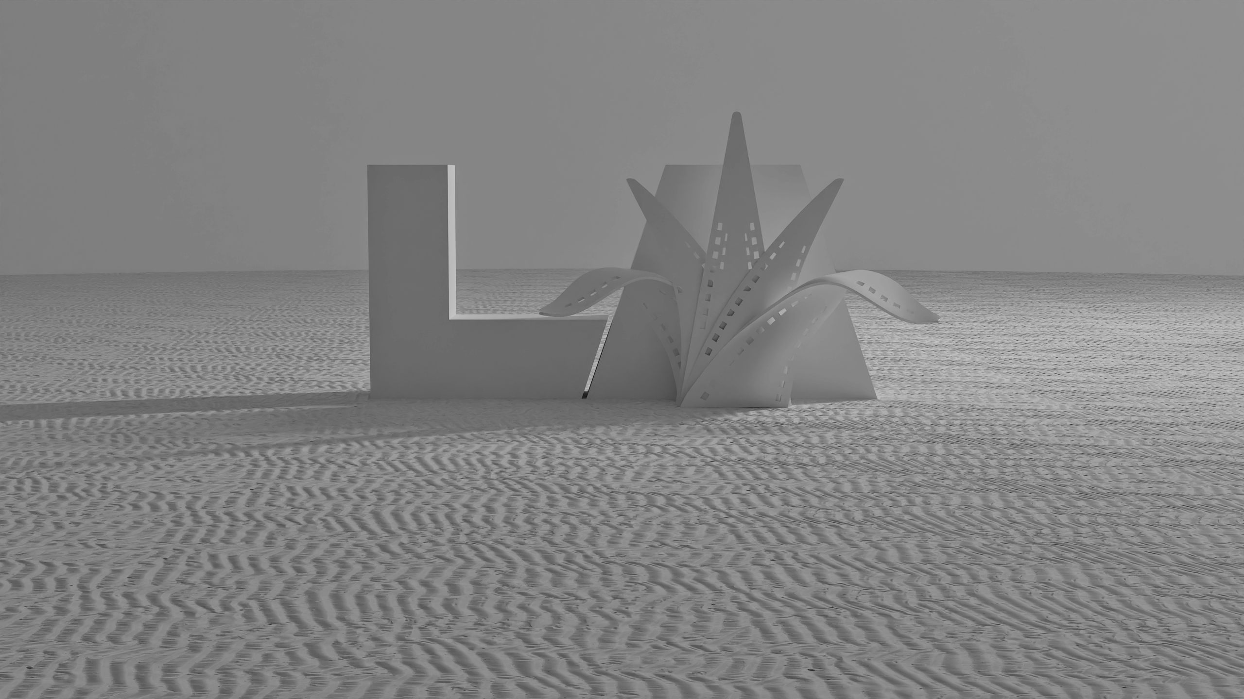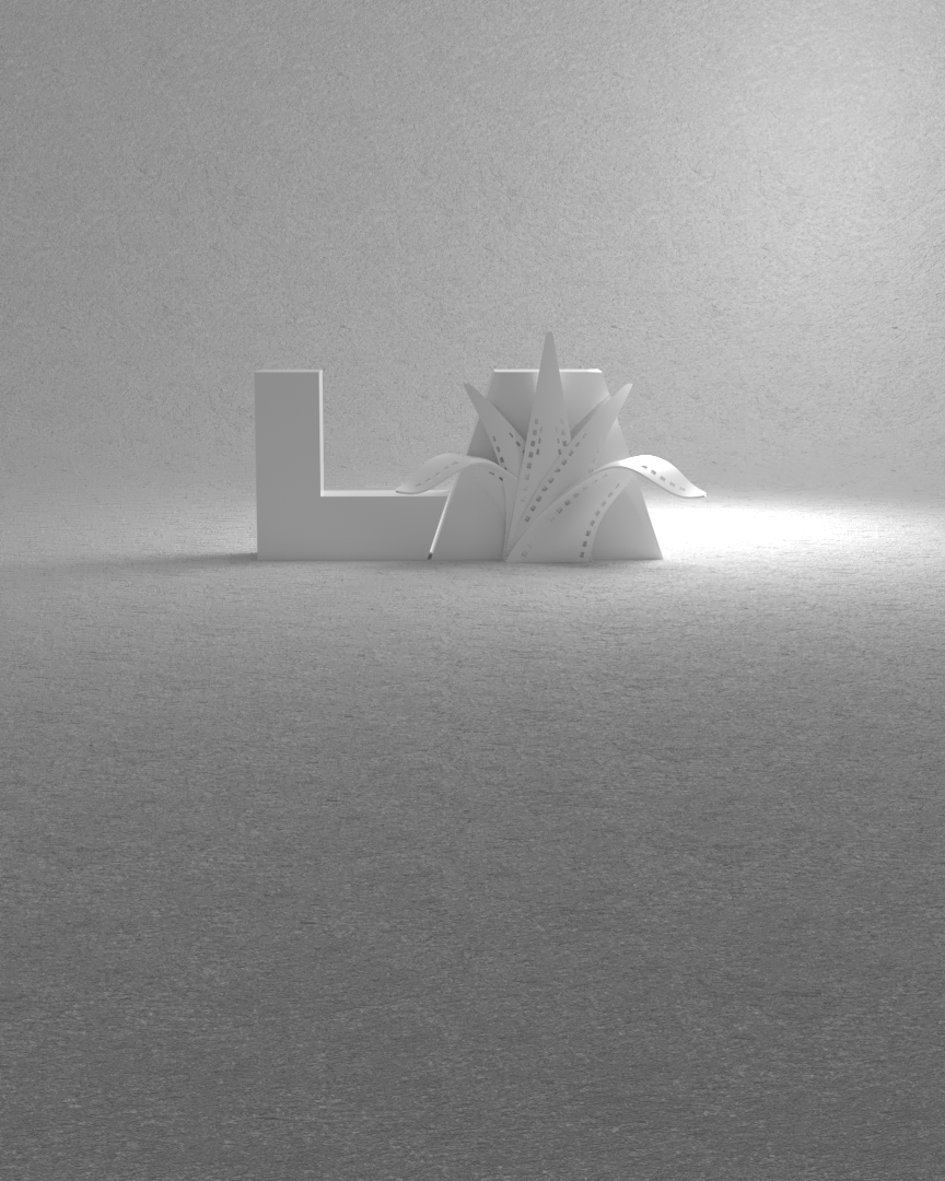 Project: 3D modeling of the Guadalajara Film Festival logo in L.A., later staged within a monochromatic environment. Two variations were created: one set in sand and another with a clean texture, each explored through different lighting arrangements within the same space.