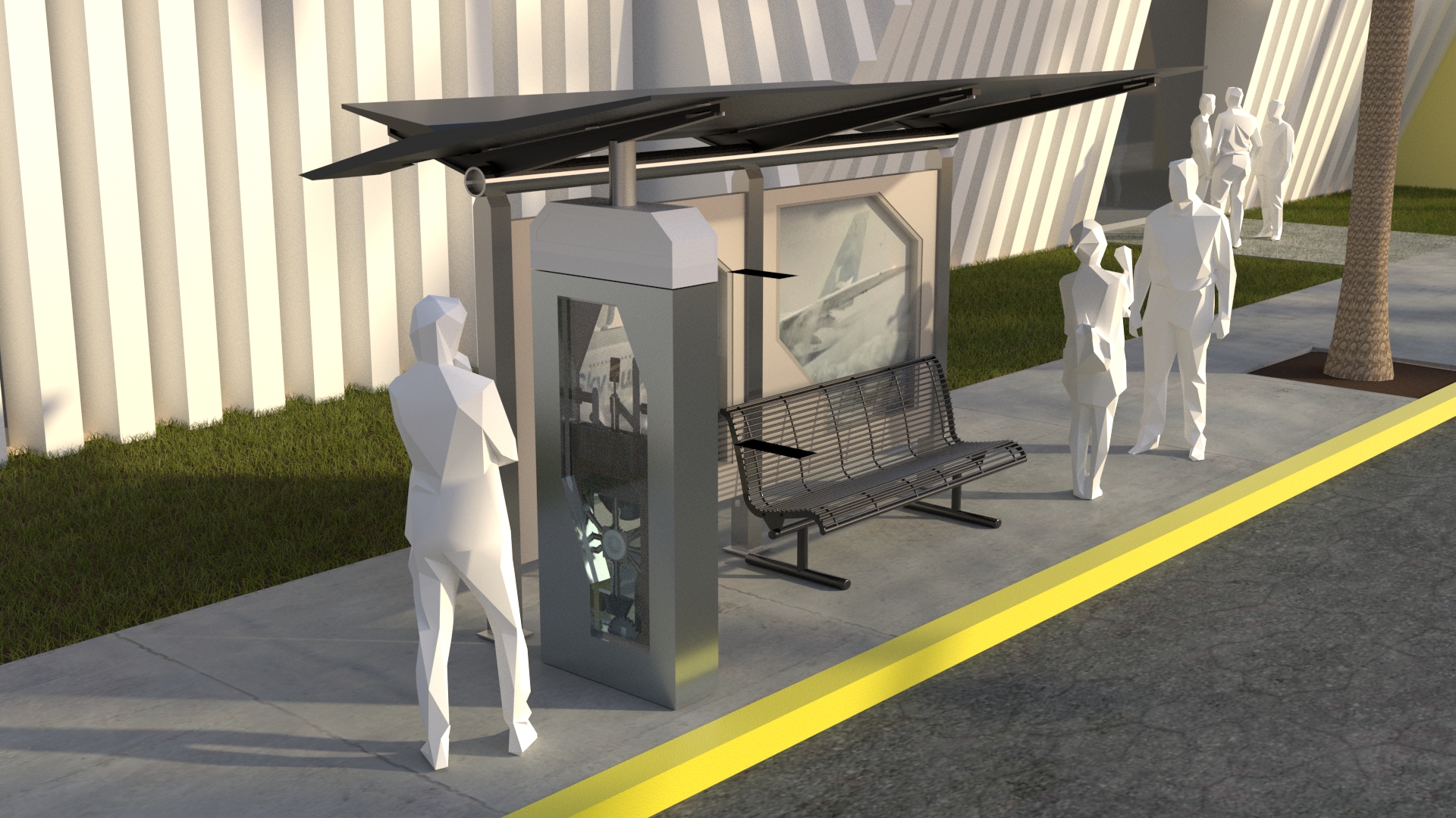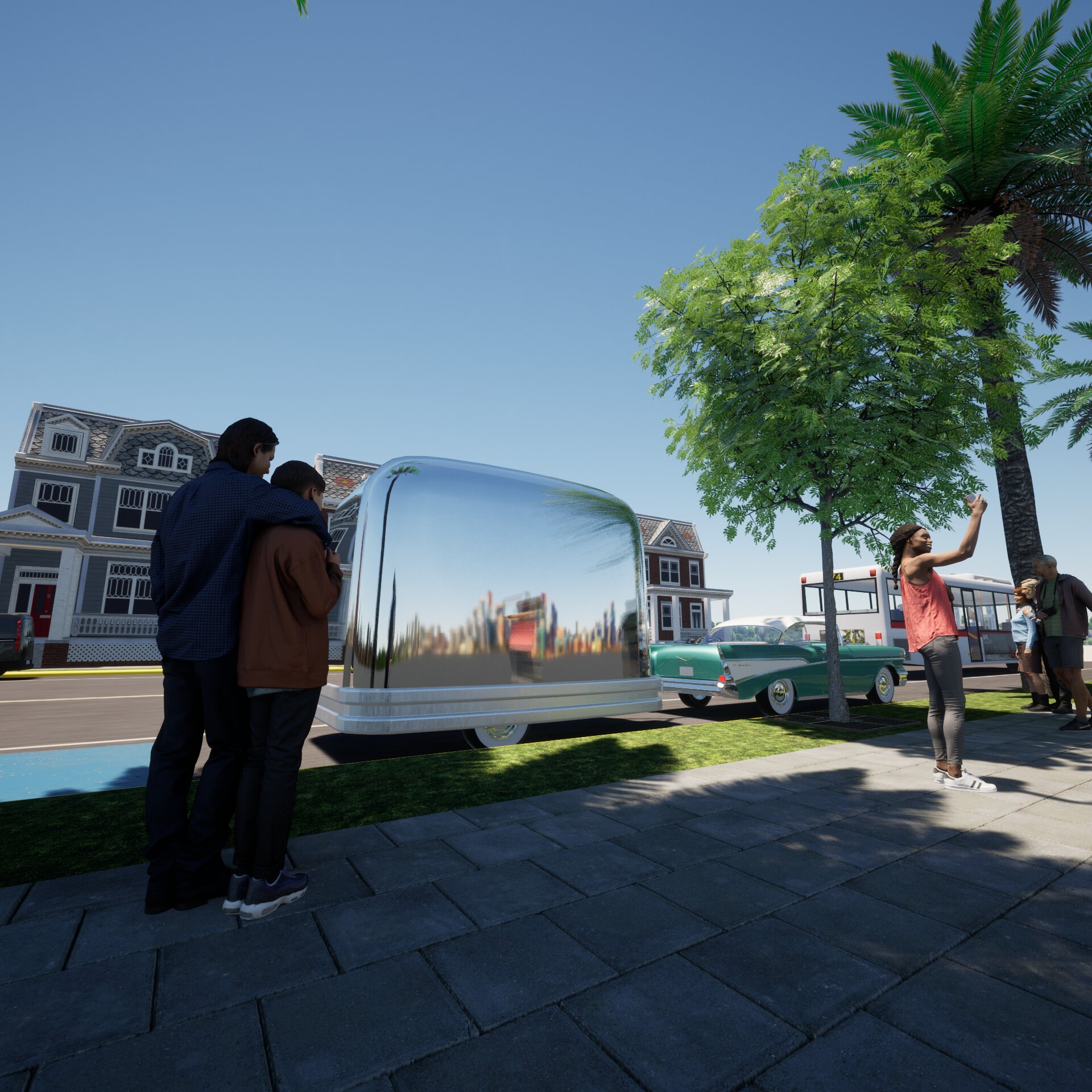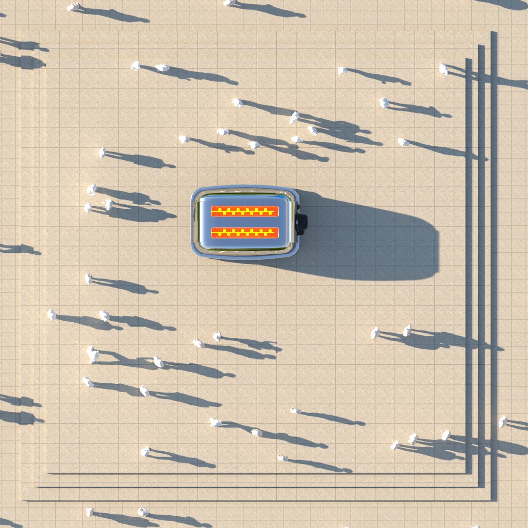 Project: Texturing and placement of a section of a jet passenger cabin on a street, shown at different times throughout the day. Human figures were also added in some of the renders.