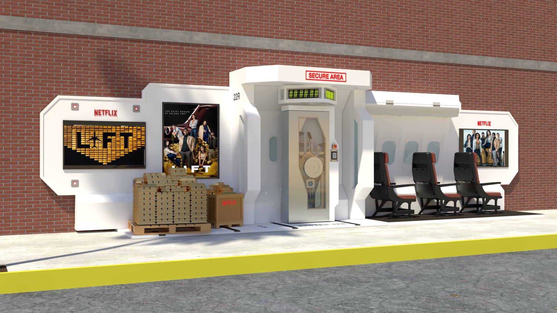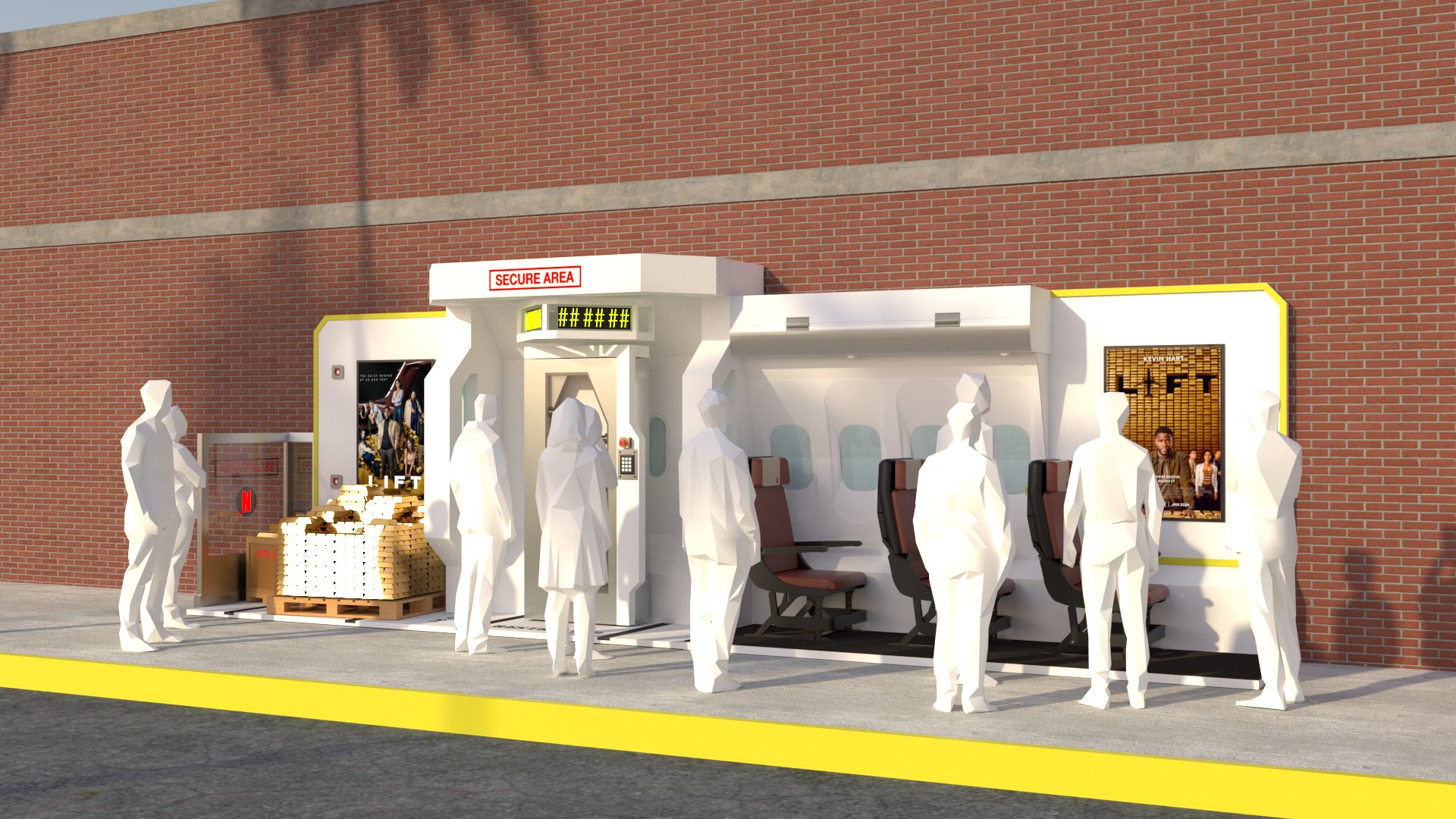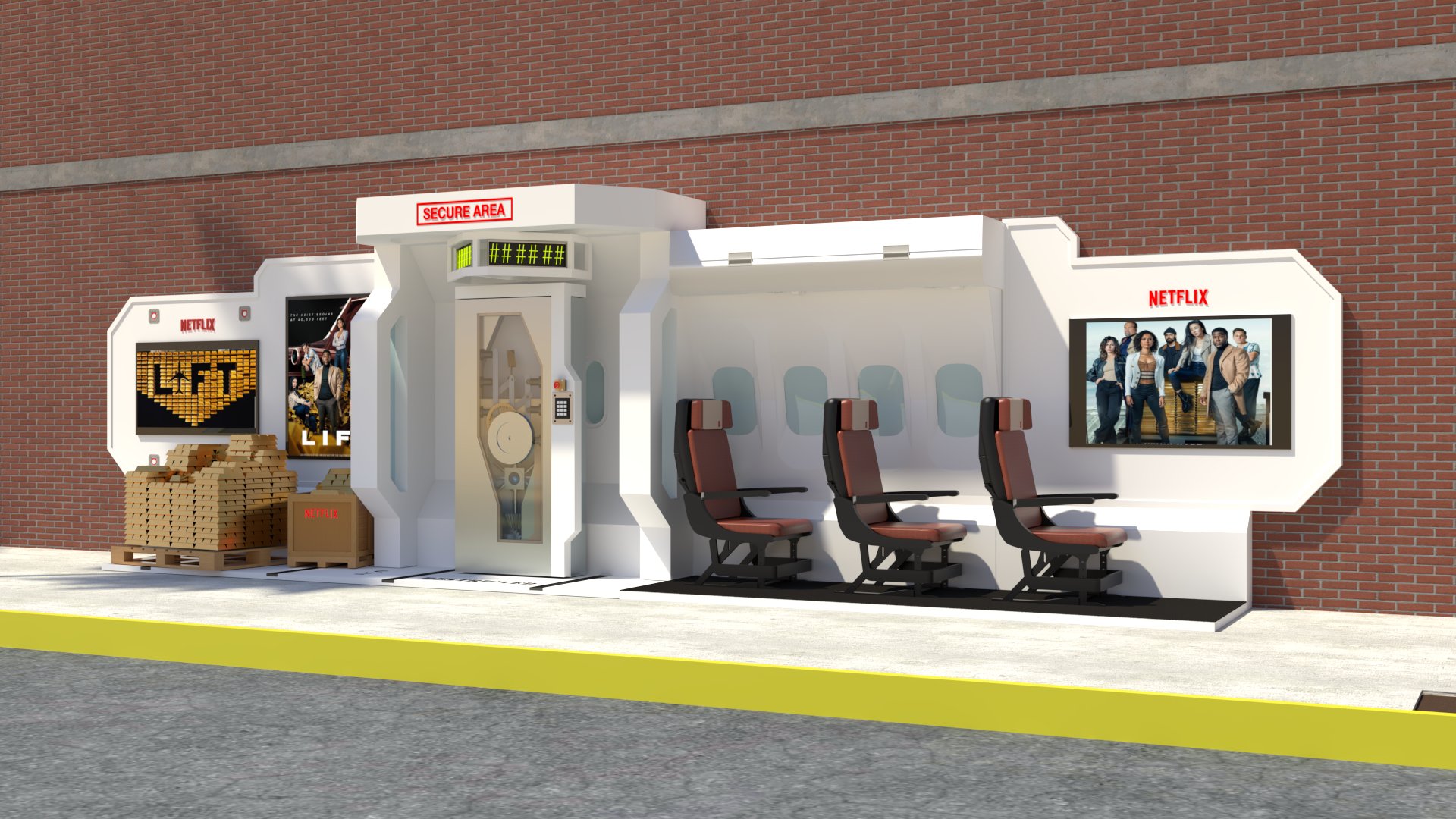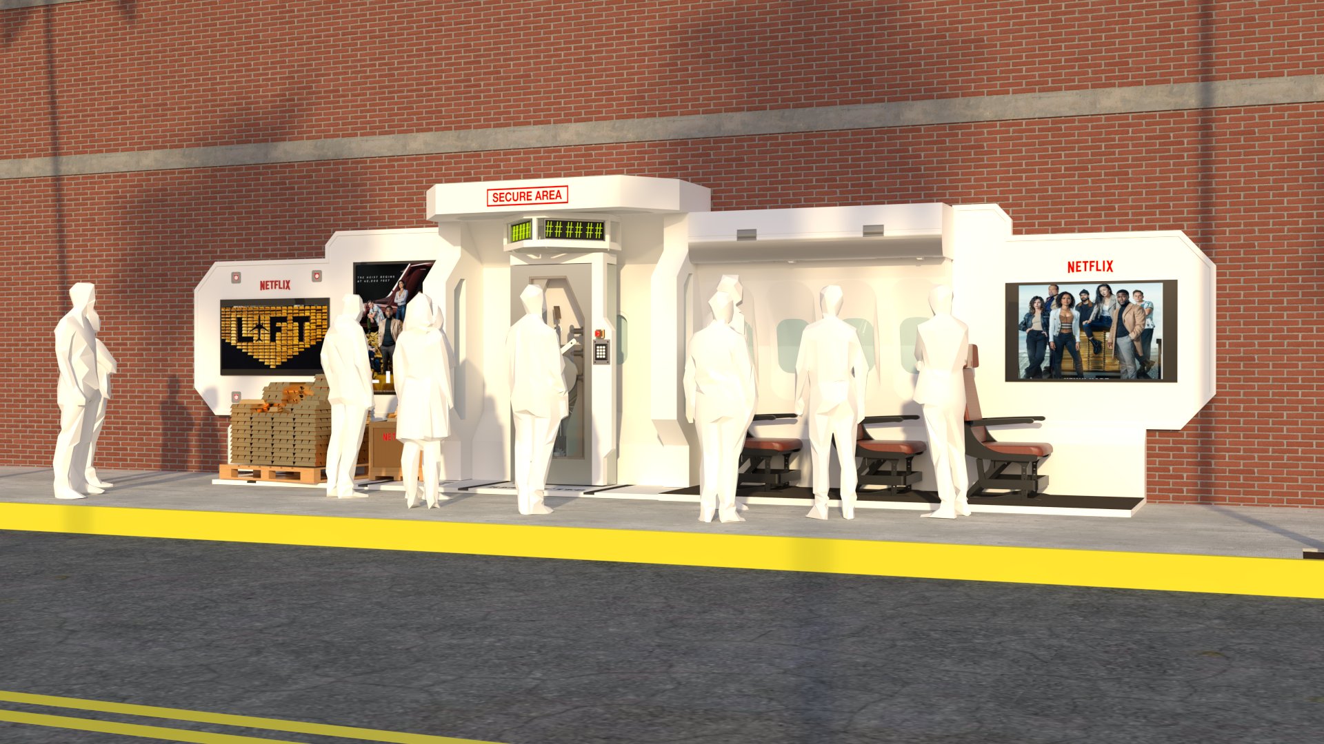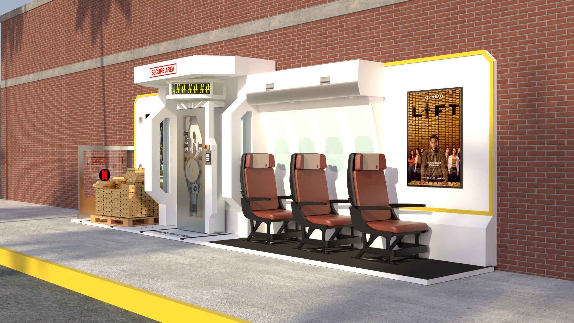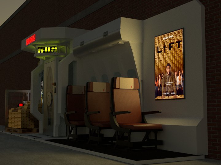 Project: Customized bus stop featuring a replica of a security vault, accompanied by posters of a film project. The space was staged to evoke a West Coast street.