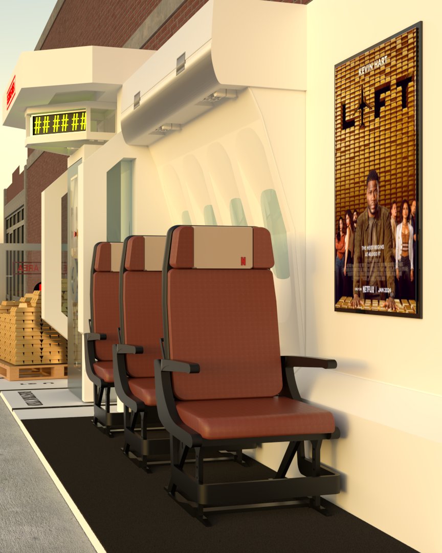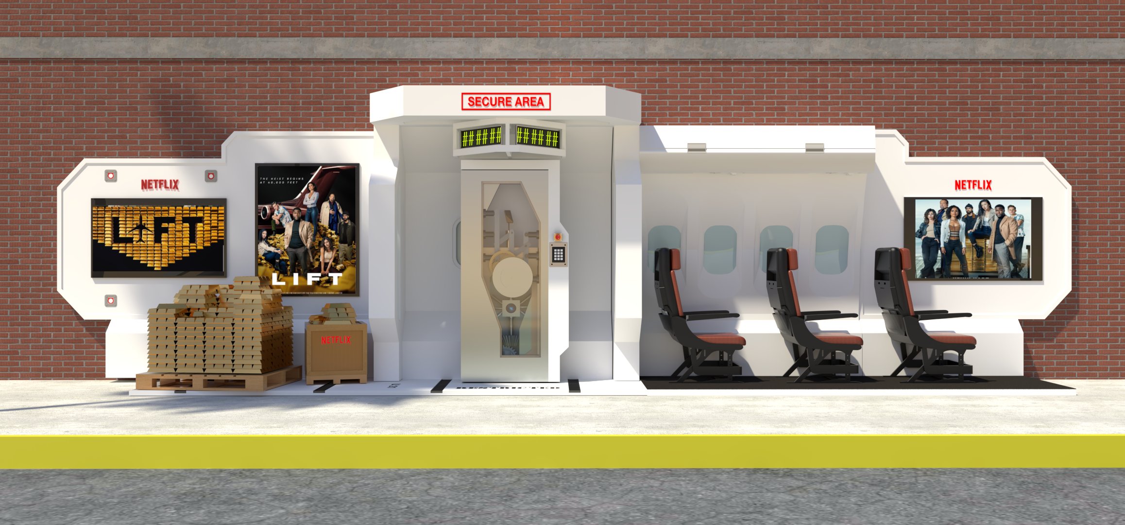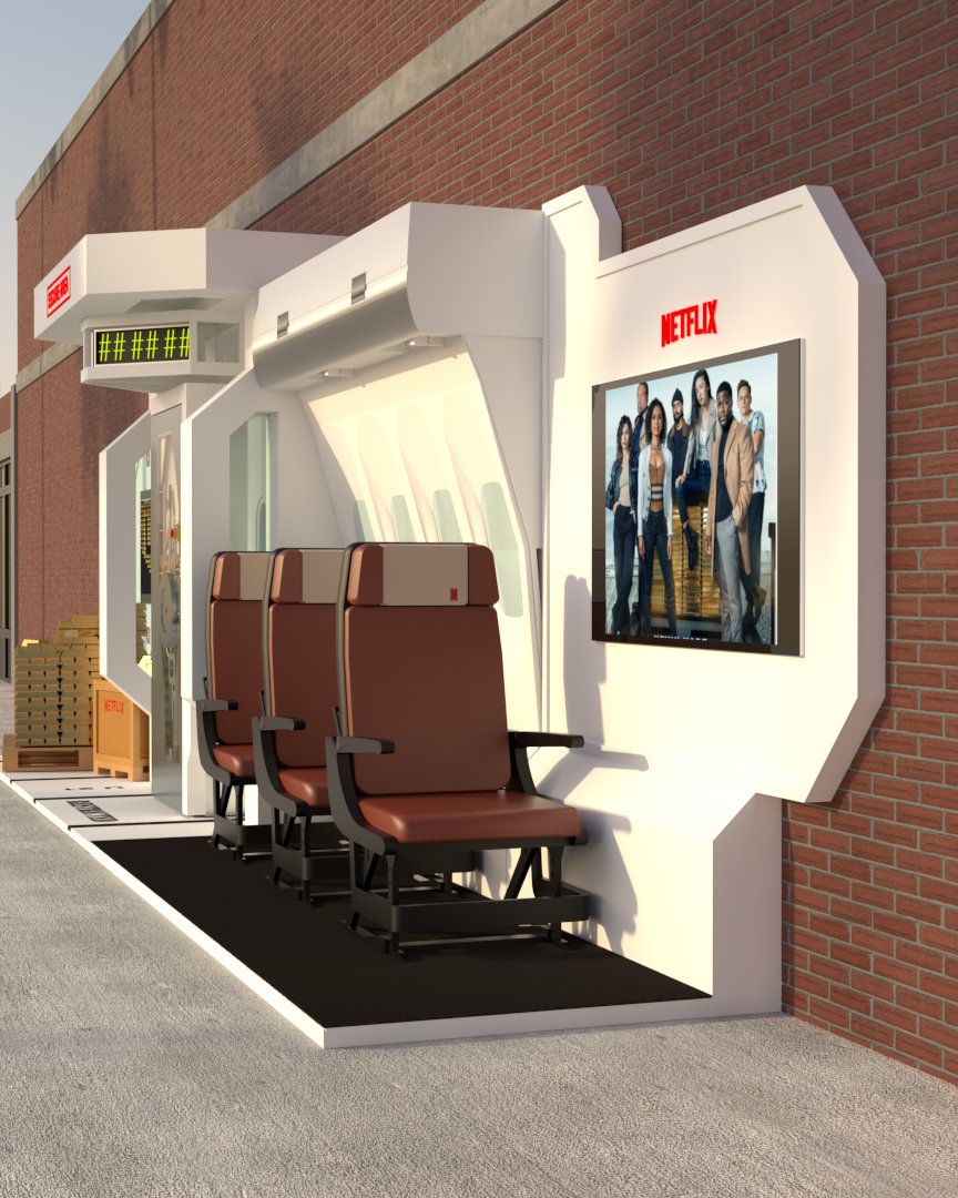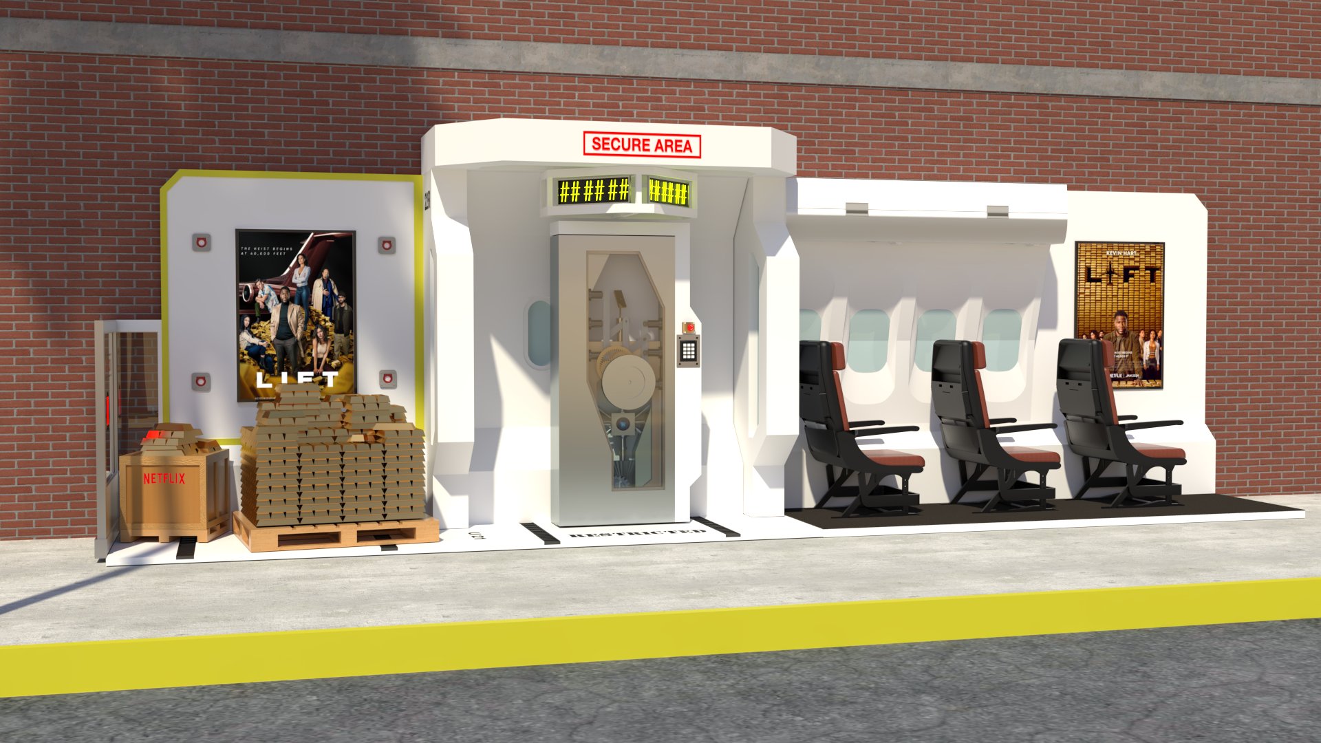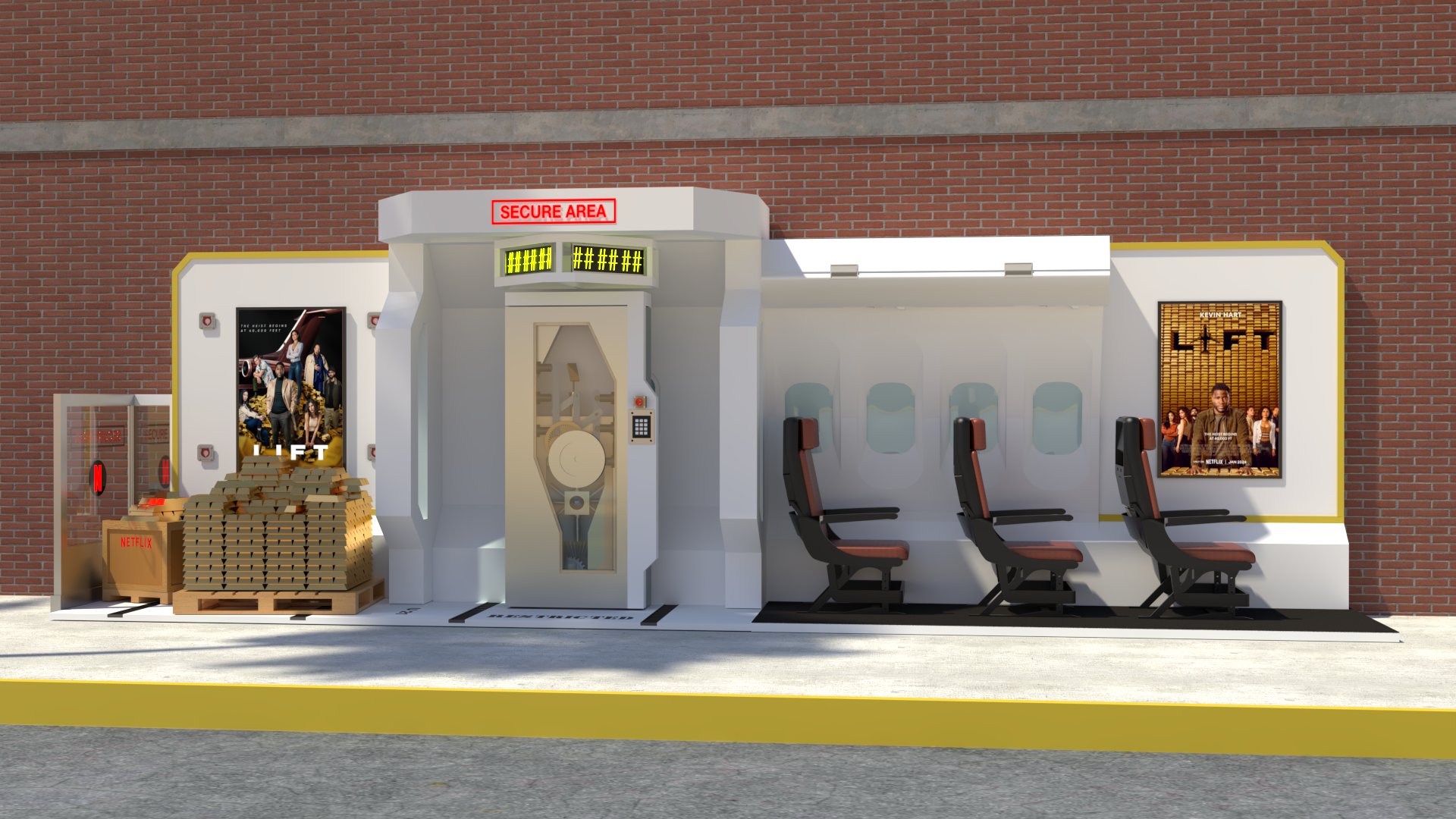 Project: Customized bus stop featuring a replica of a security vault, accompanied by posters of a film project. The space was staged to evoke a West Coast street.