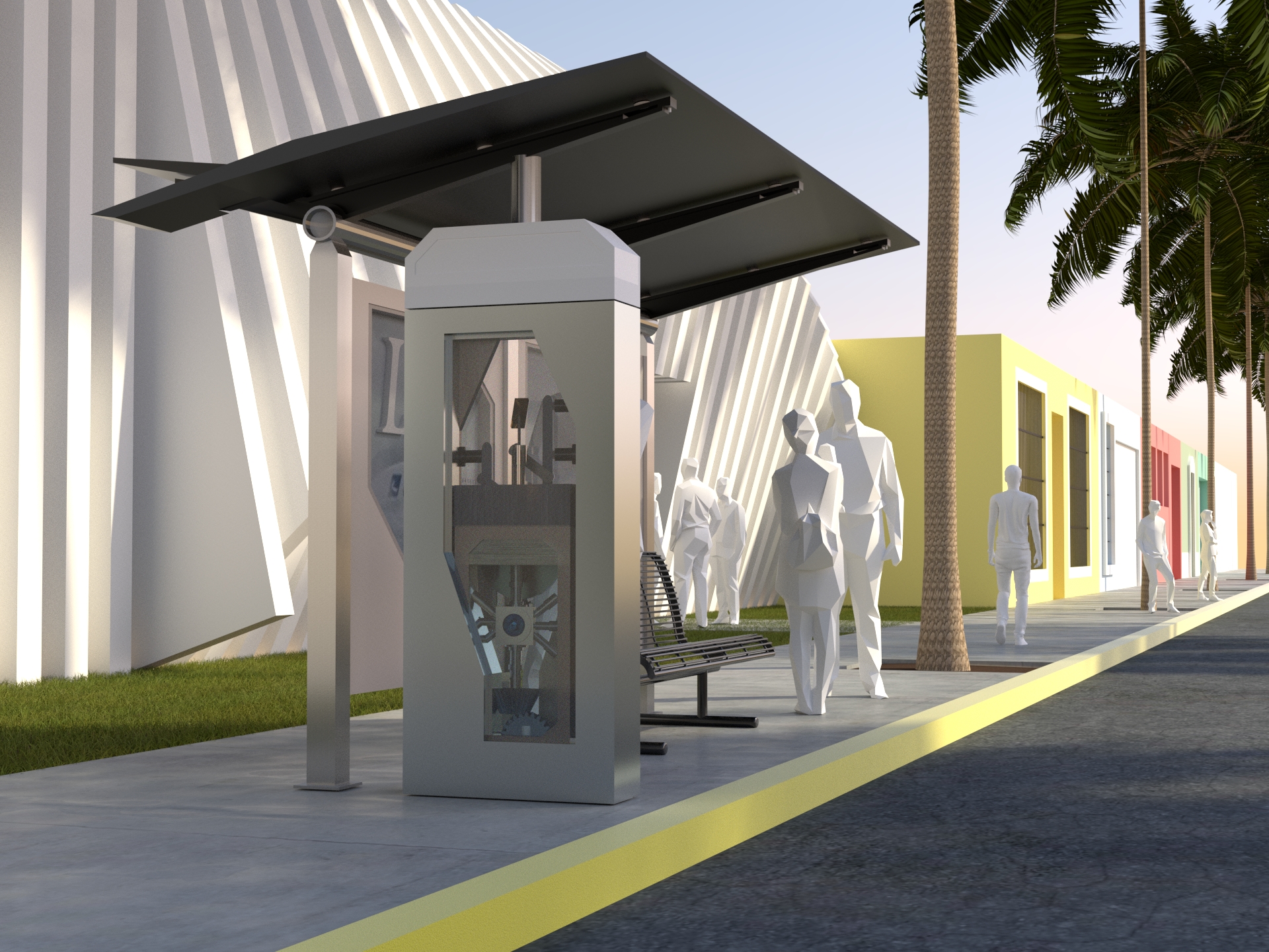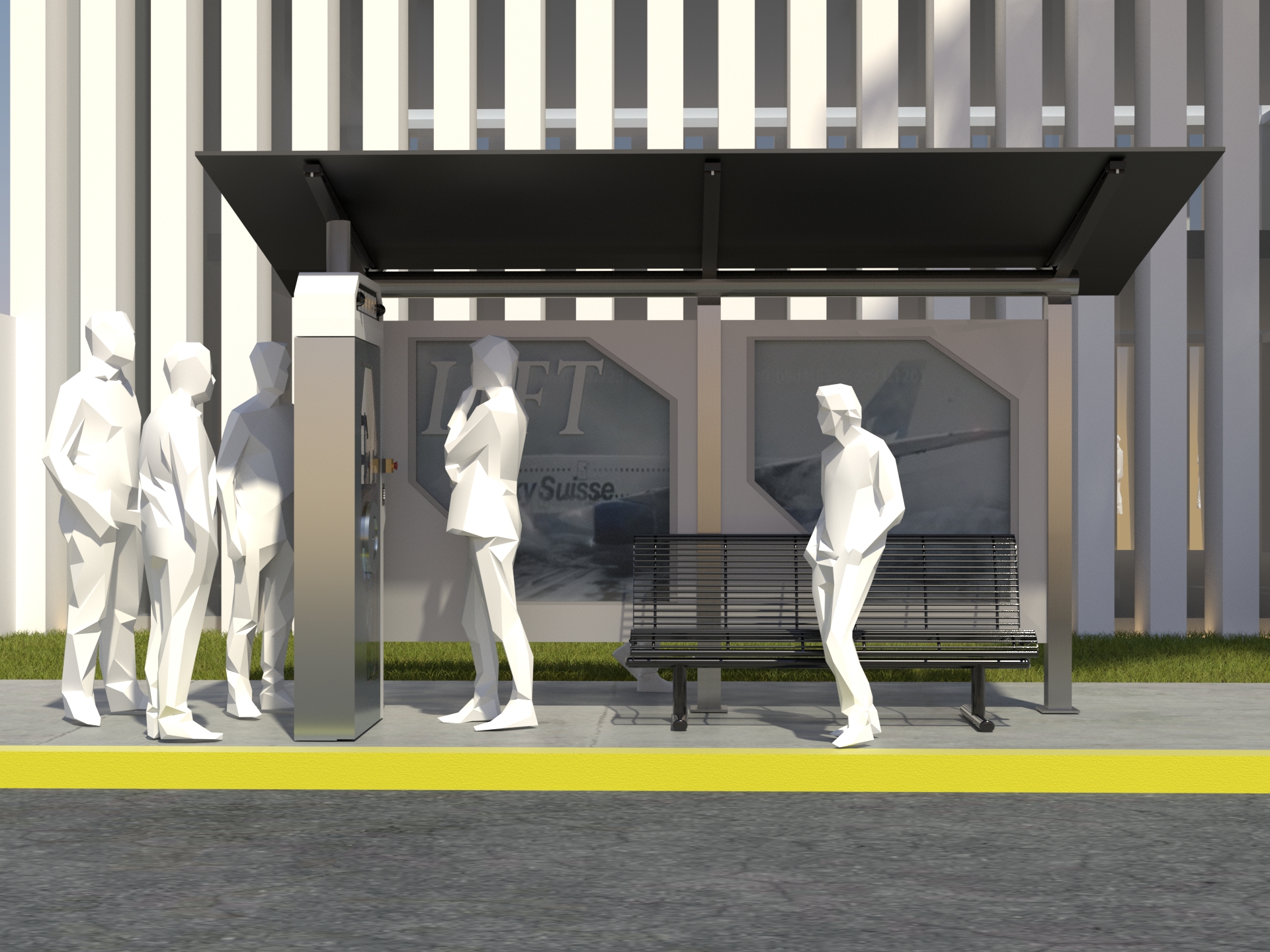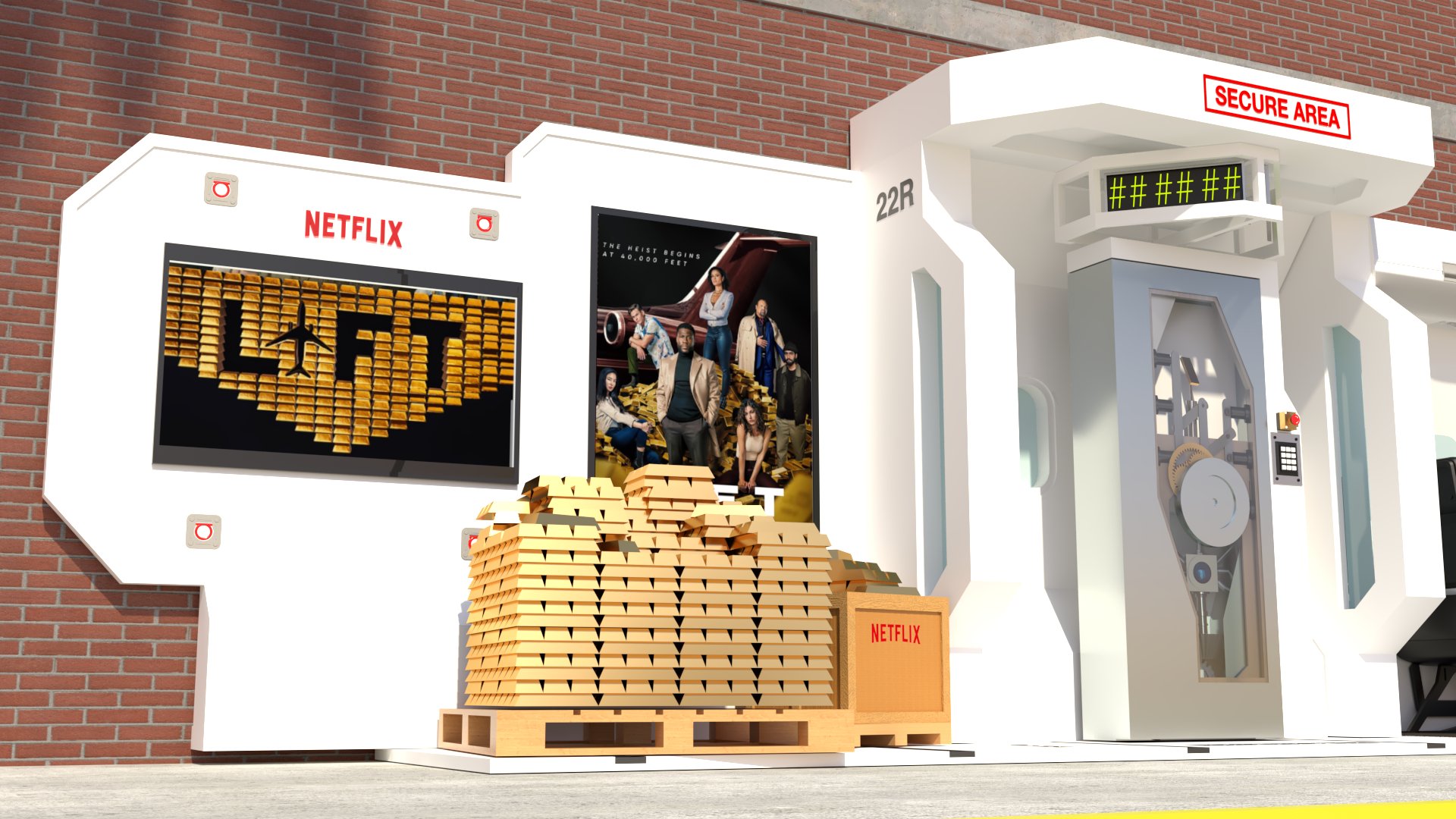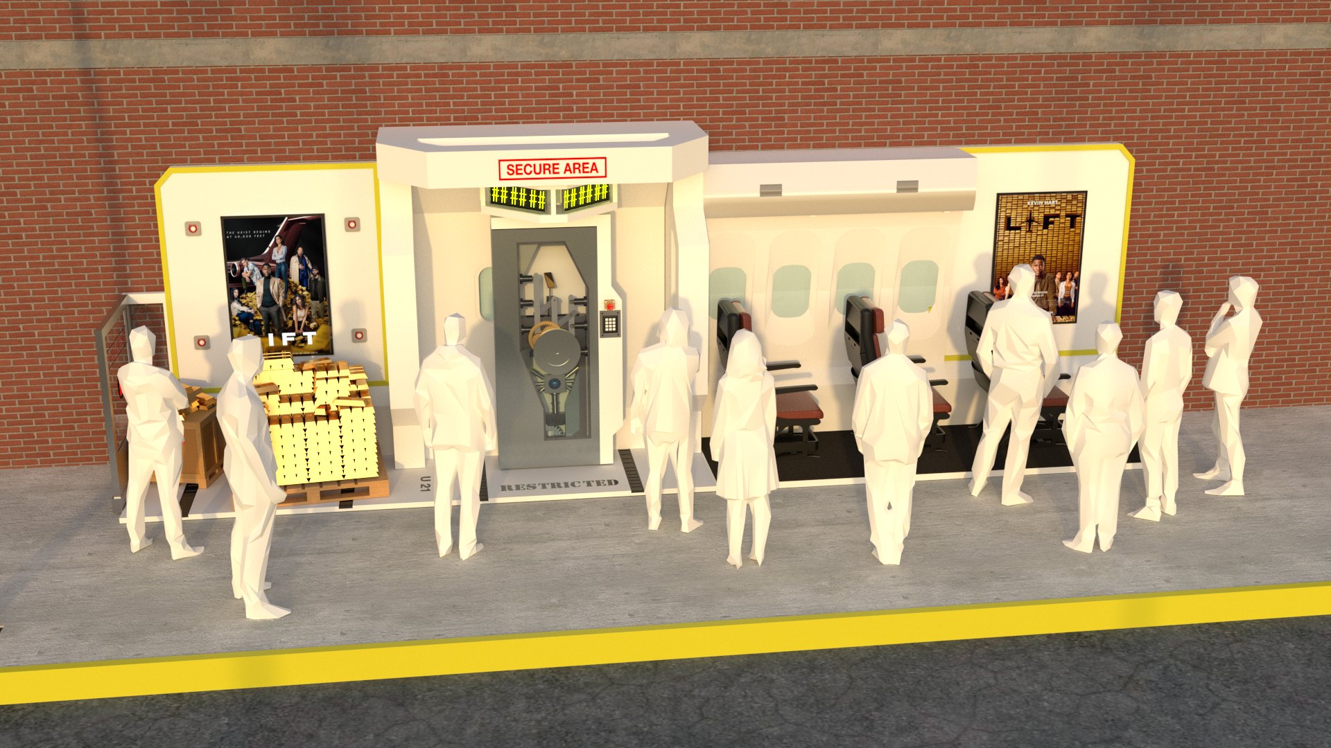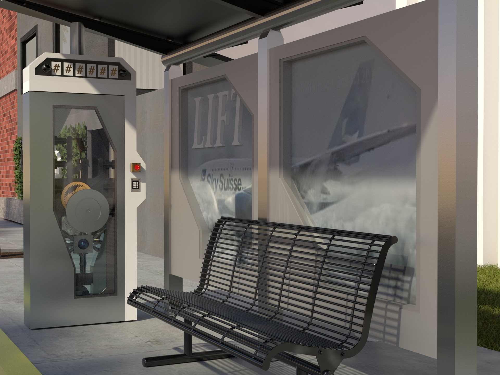 Project: Customized bus stop featuring a replica of a security vault, accompanied by posters of a film project. The space was staged to evoke a West Coast street.