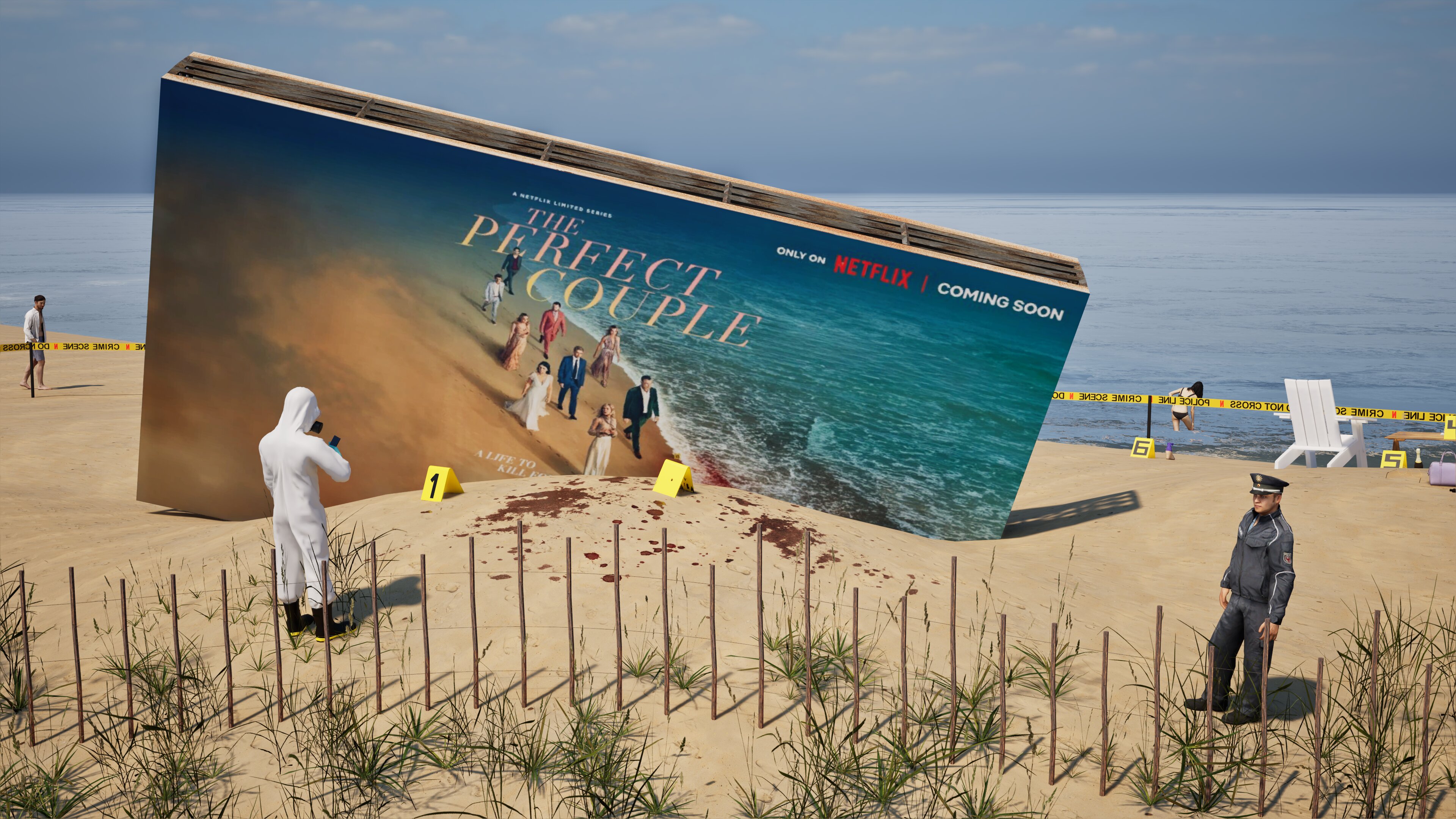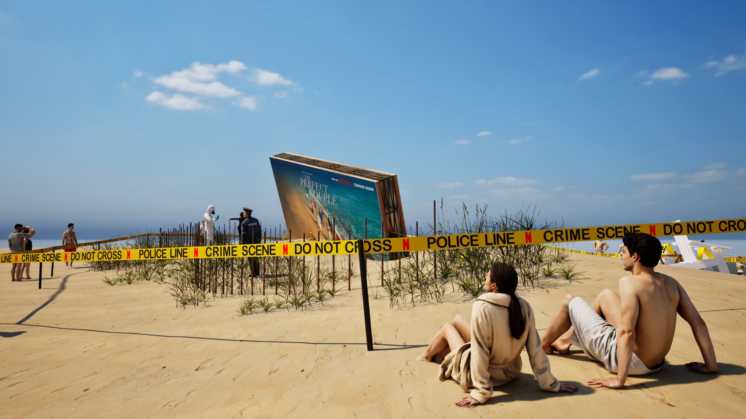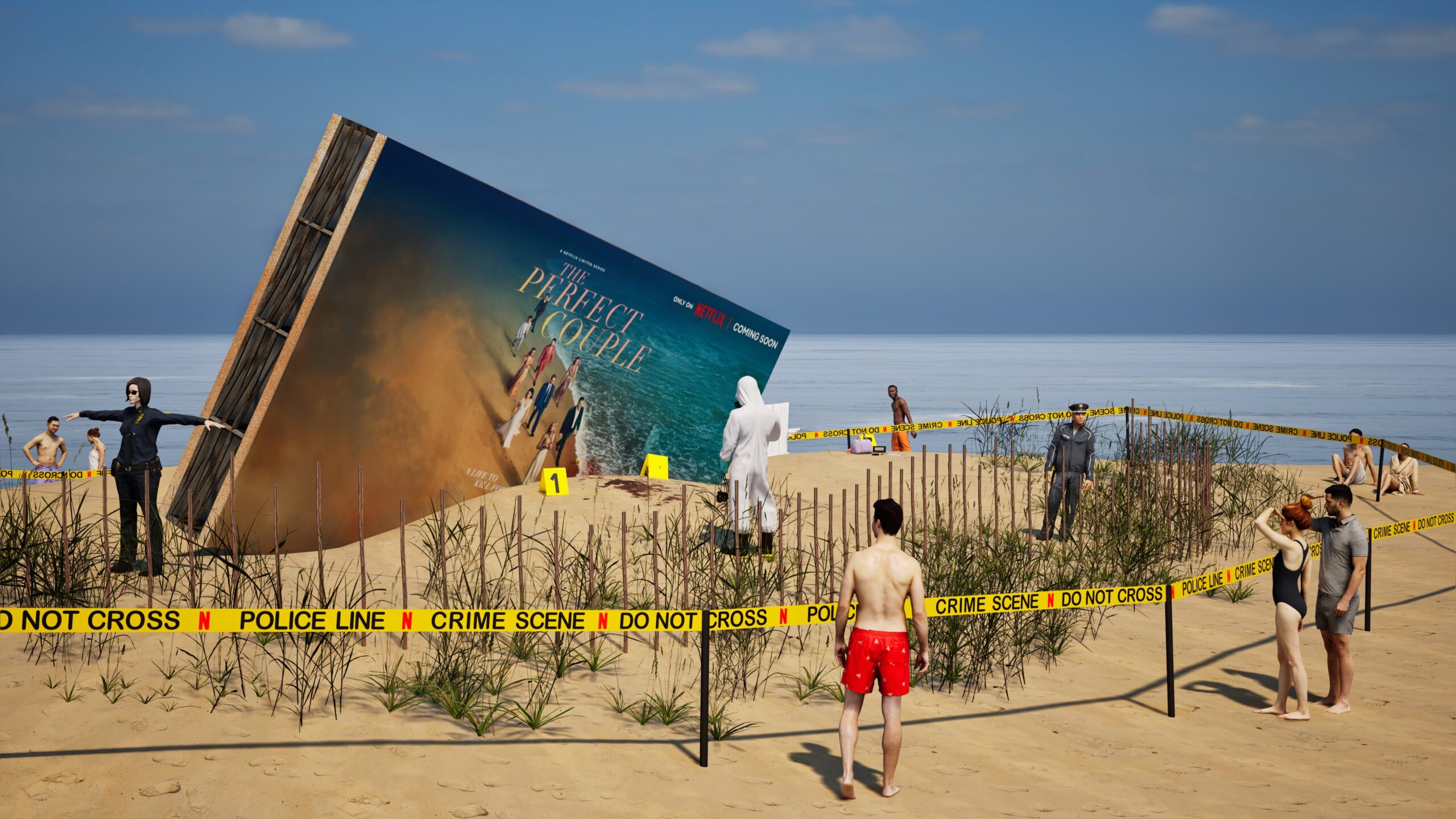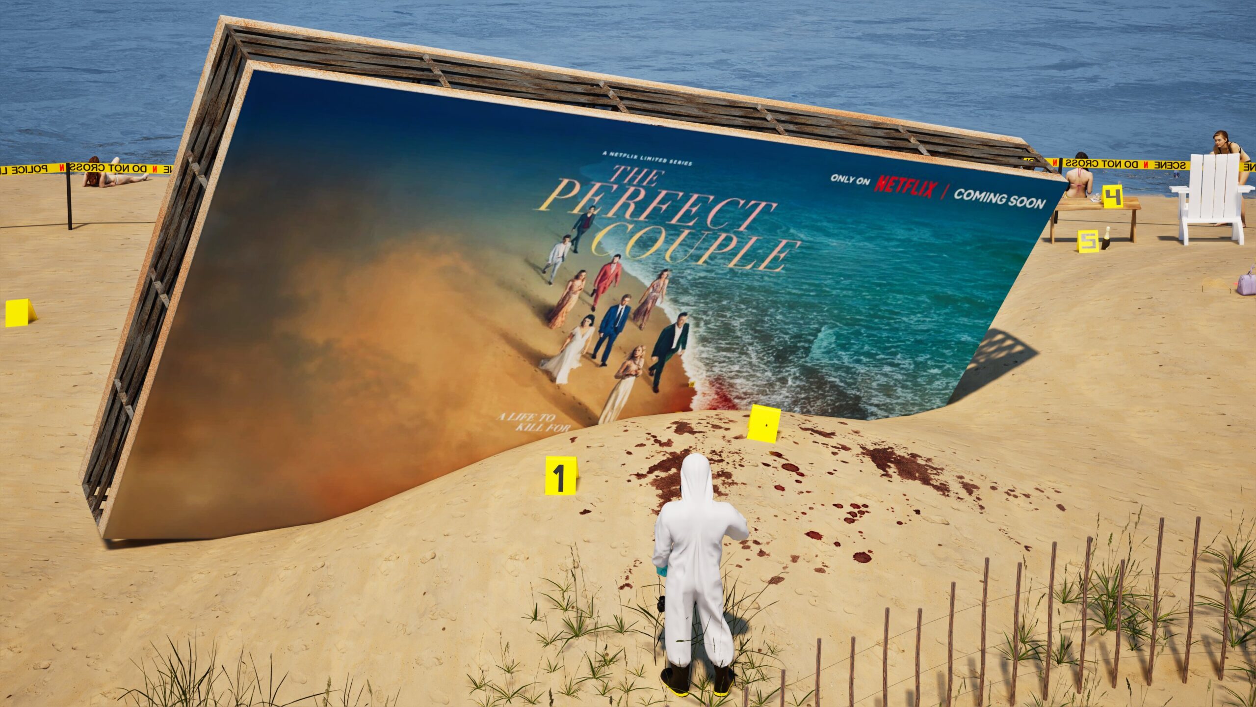 Project: Emulation of a crime scene on a beach, featuring a central billboard installation. The space was cordoned off with custom crime scene tape, numbered evidence markers, and supported by the presence of police and forensic figures.
