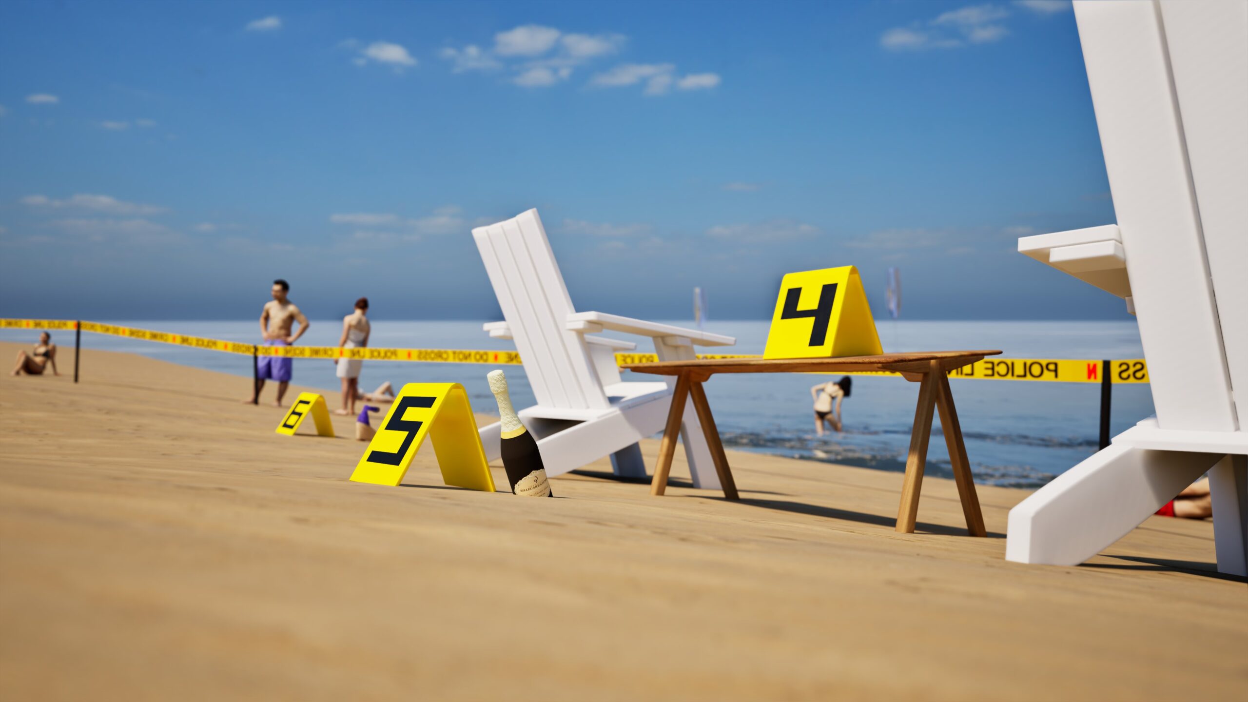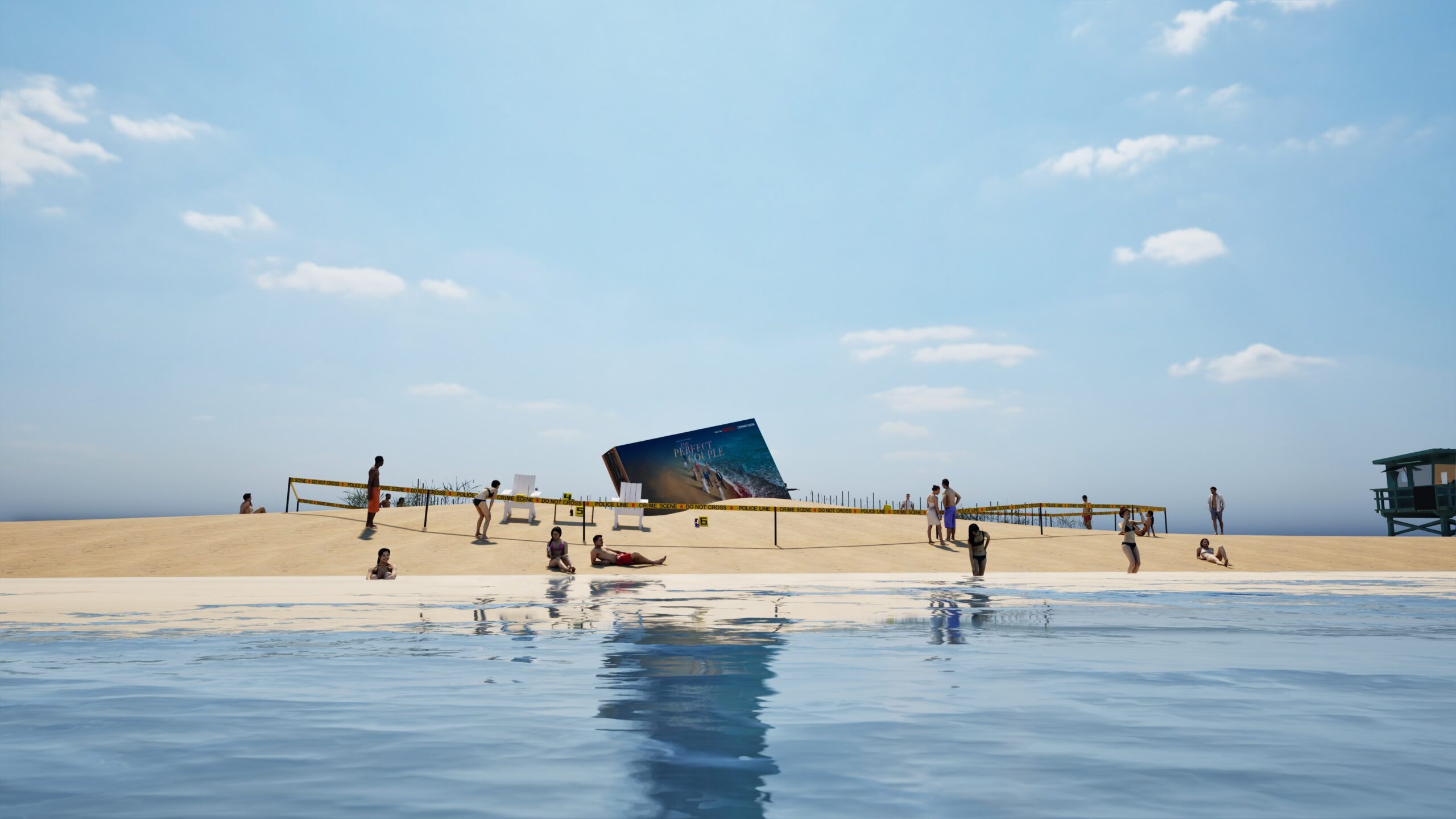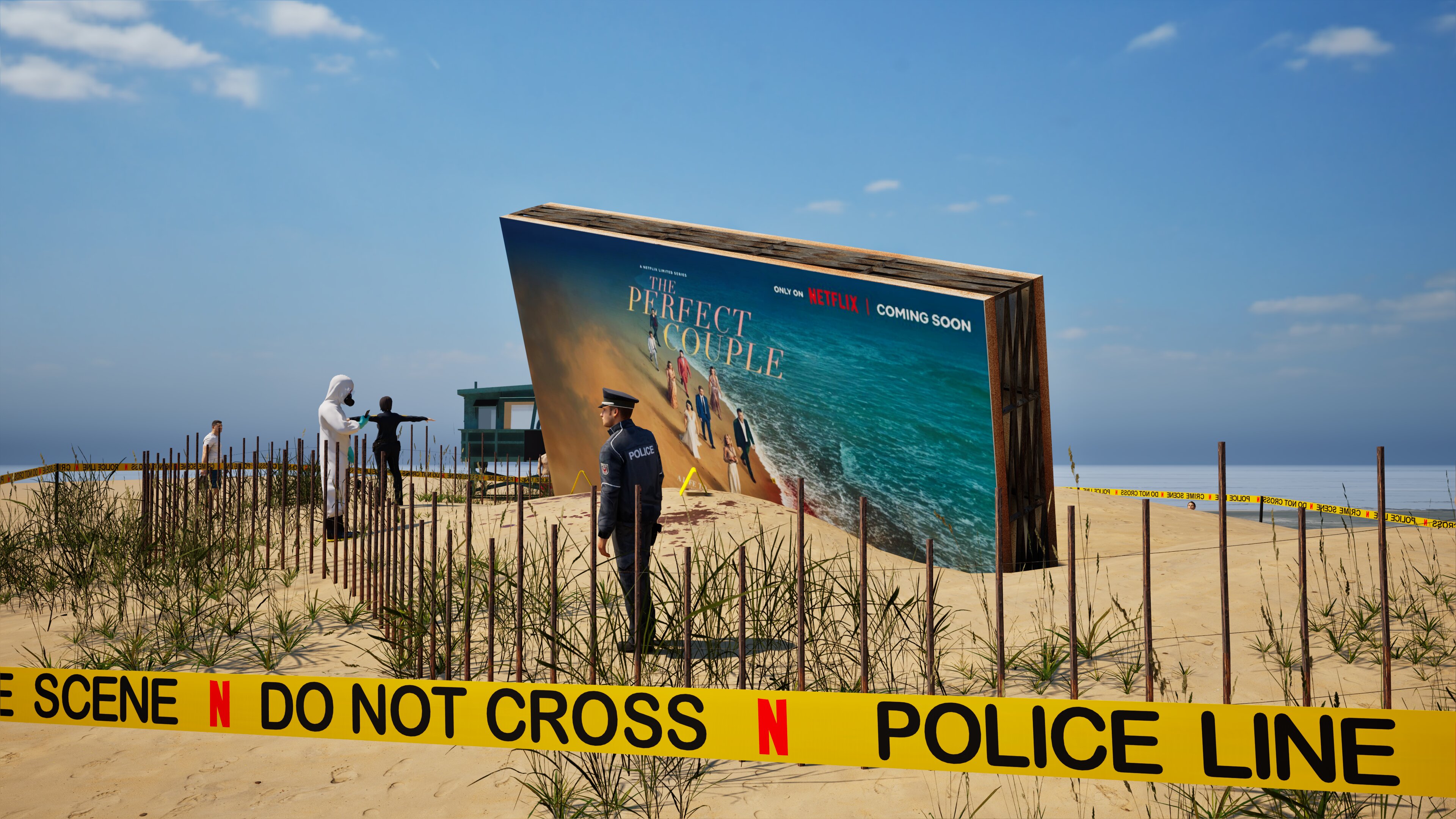Project: Emulation of a crime scene on a beach, featuring a central billboard installation. The space was cordoned off with custom crime scene tape, numbered evidence markers, and supported by the presence of police and forensic figures.