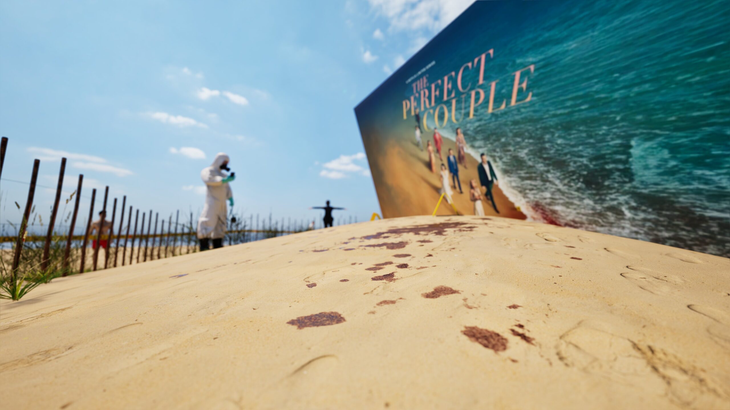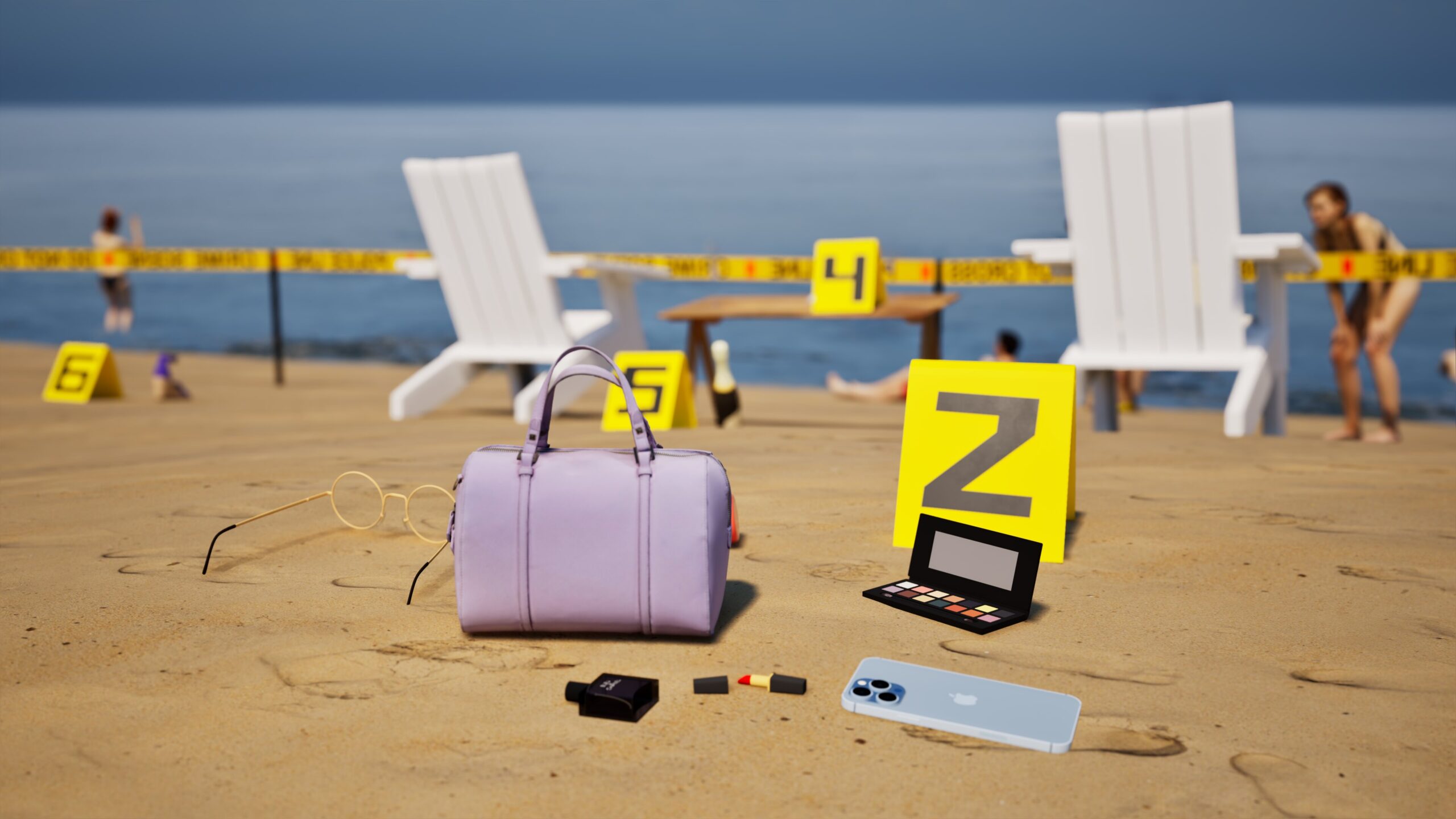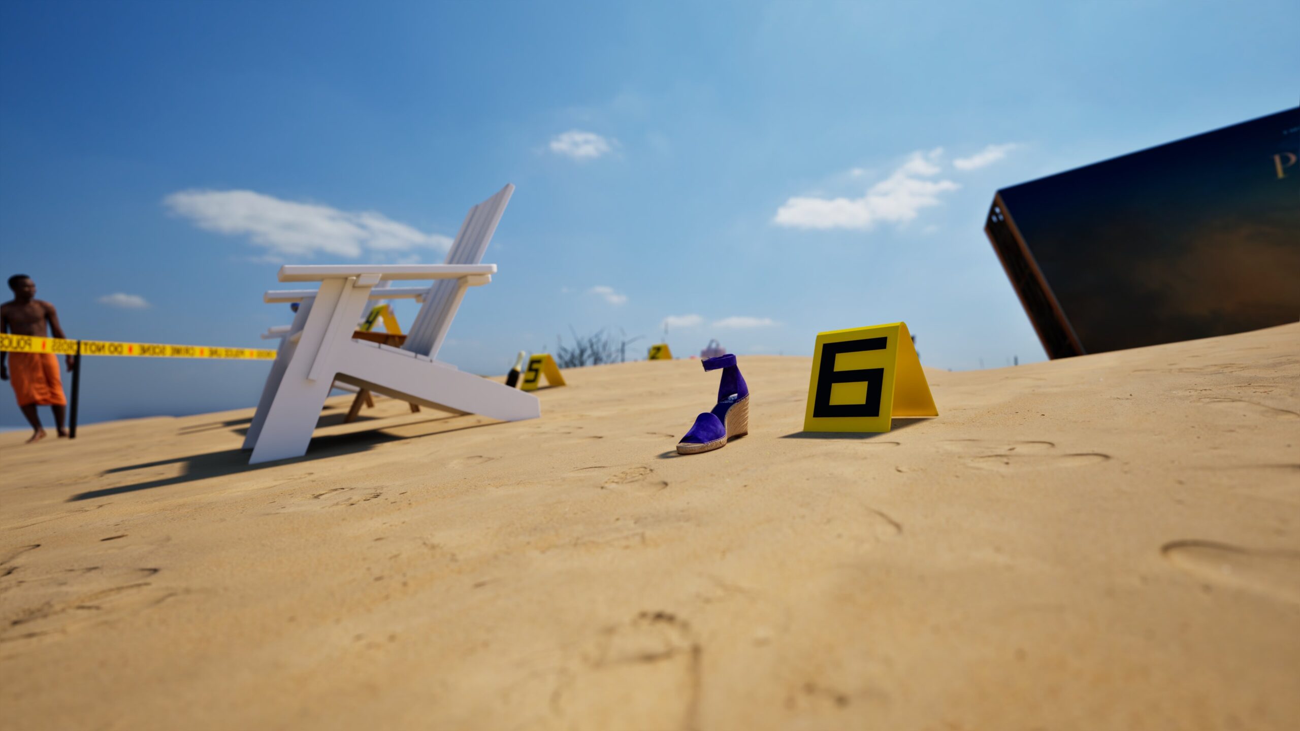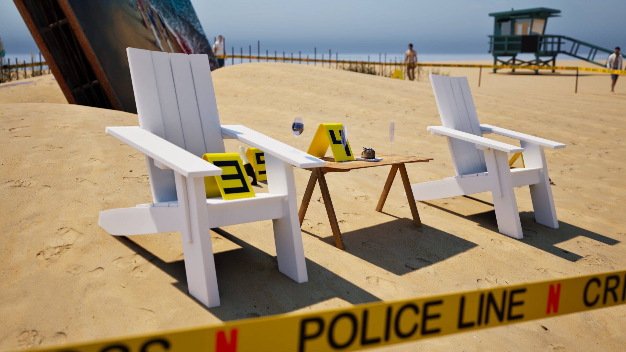 Project: Emulation of a crime scene on a beach, featuring a central billboard installation. The space was cordoned off with custom crime scene tape, numbered evidence markers, and supported by the presence of police and forensic figures.