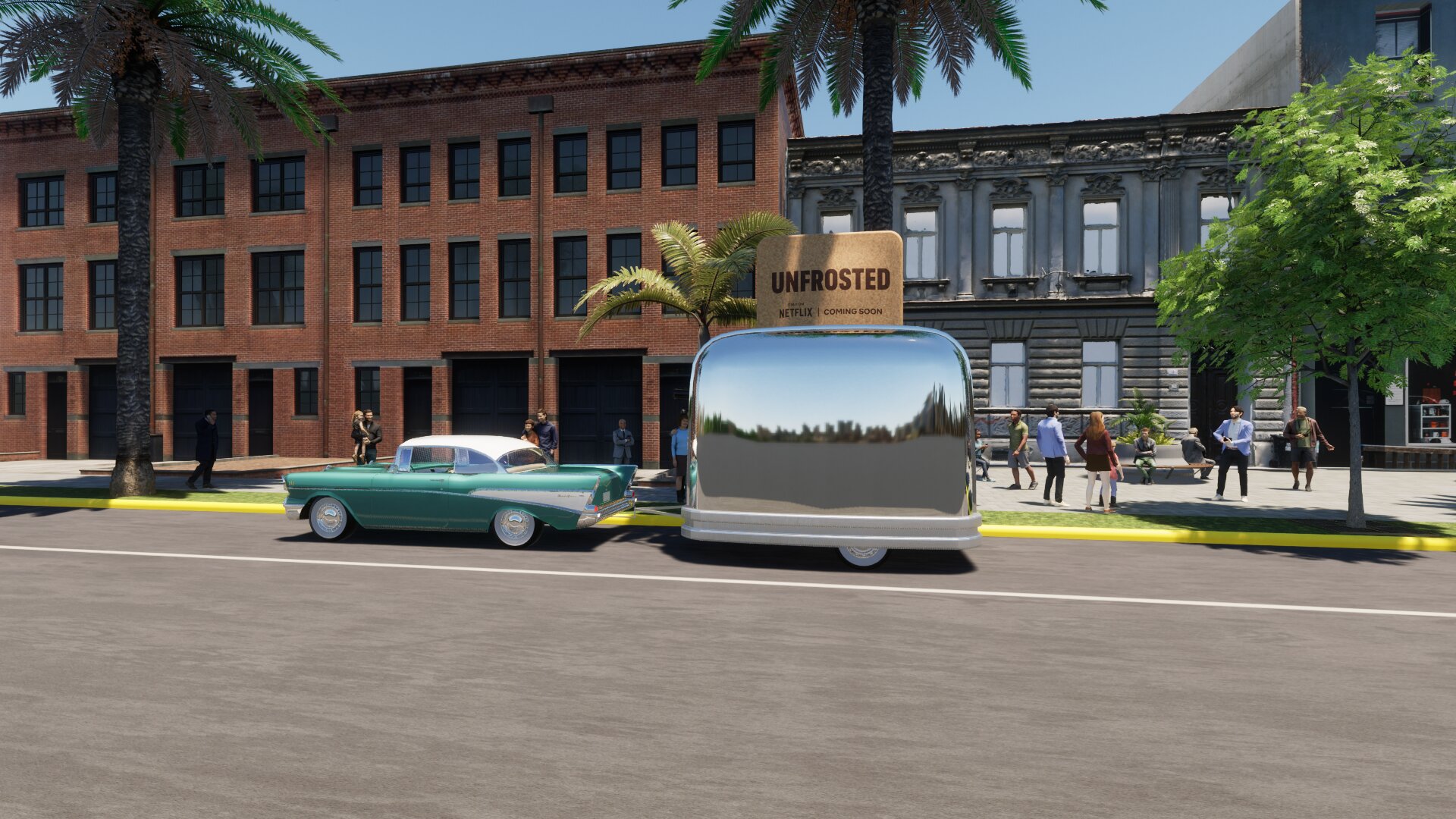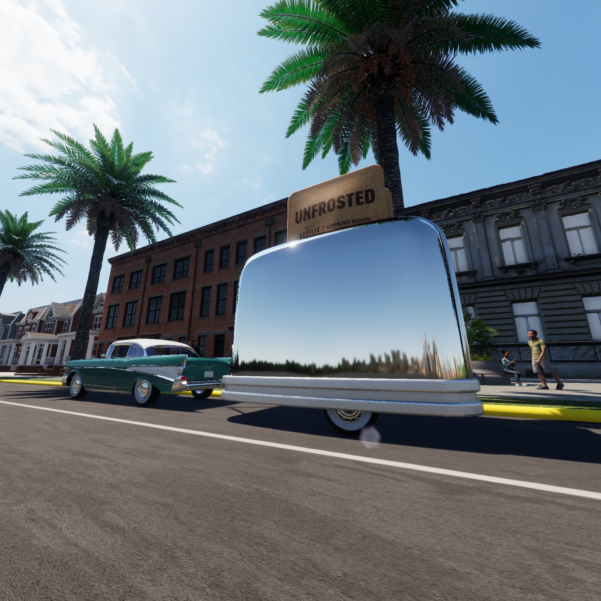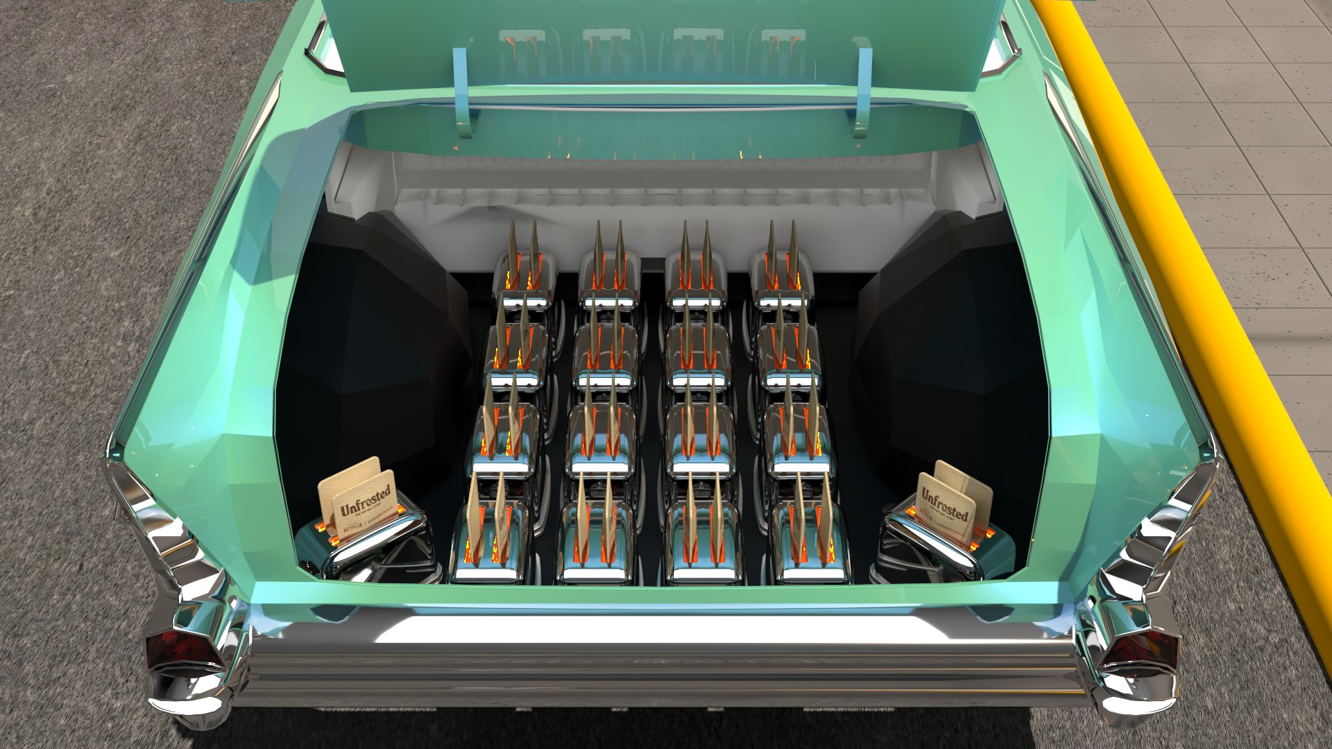 Project: Trailer adapted into the shape of a toaster, towed by a classic car. Parked in an urban setting, on a street with continuous pedestrian flow—emulating several passersby stop to engage with the vehicle. Inside the car’s trunk, multiple toasters are neatly arranged.