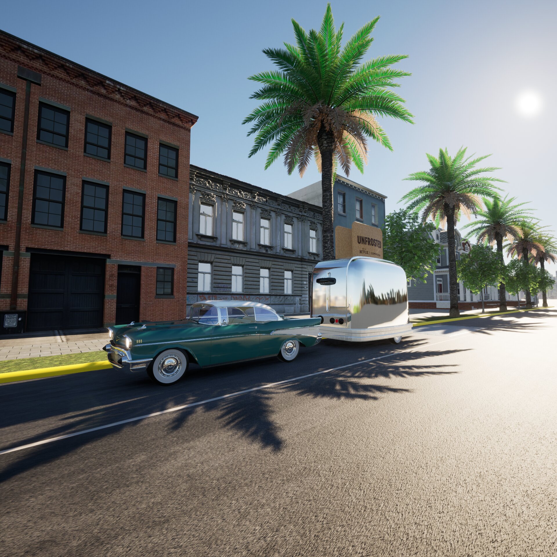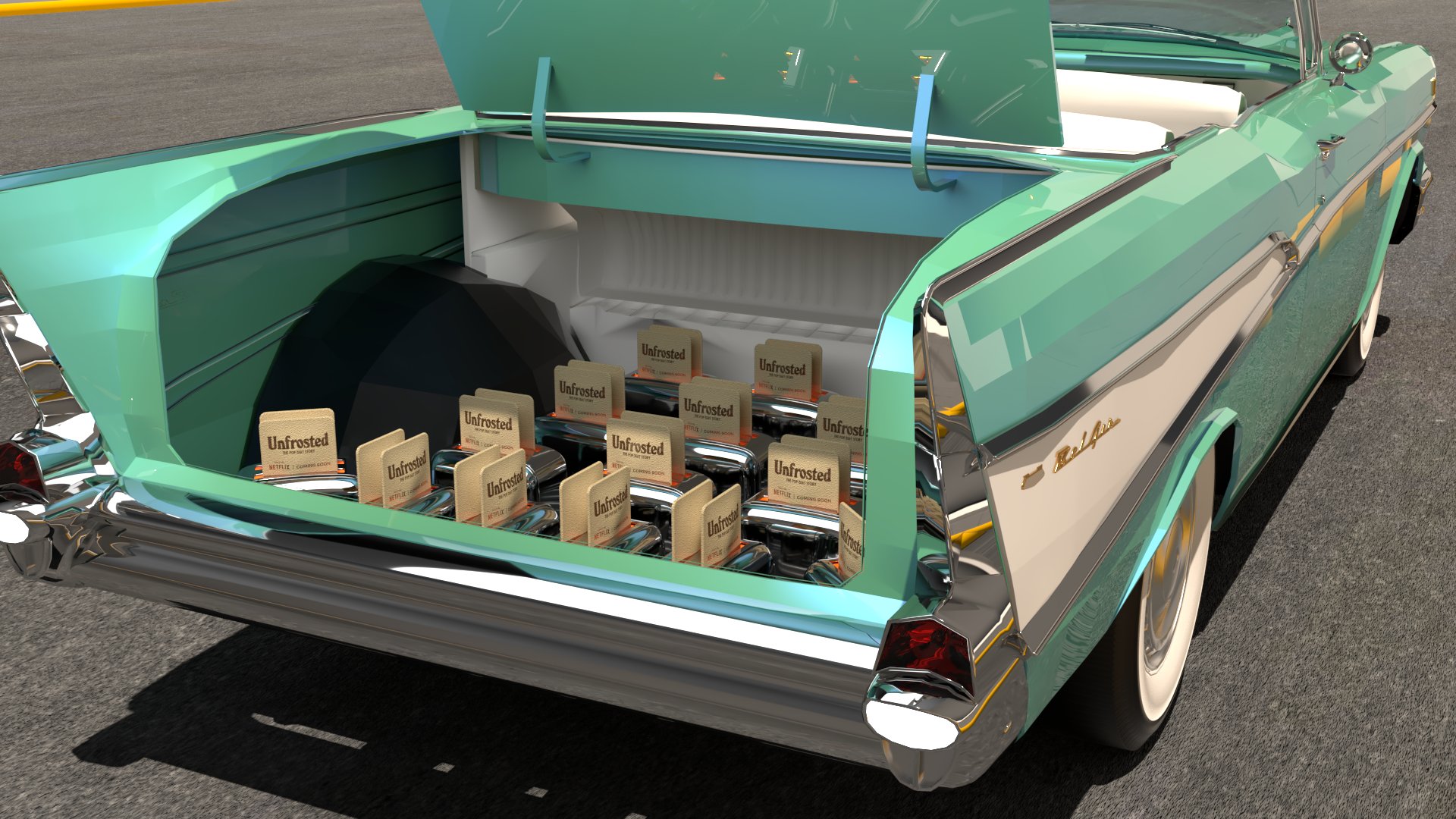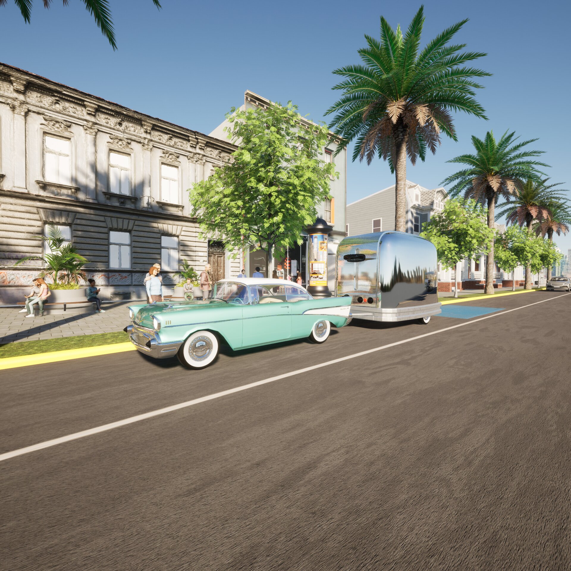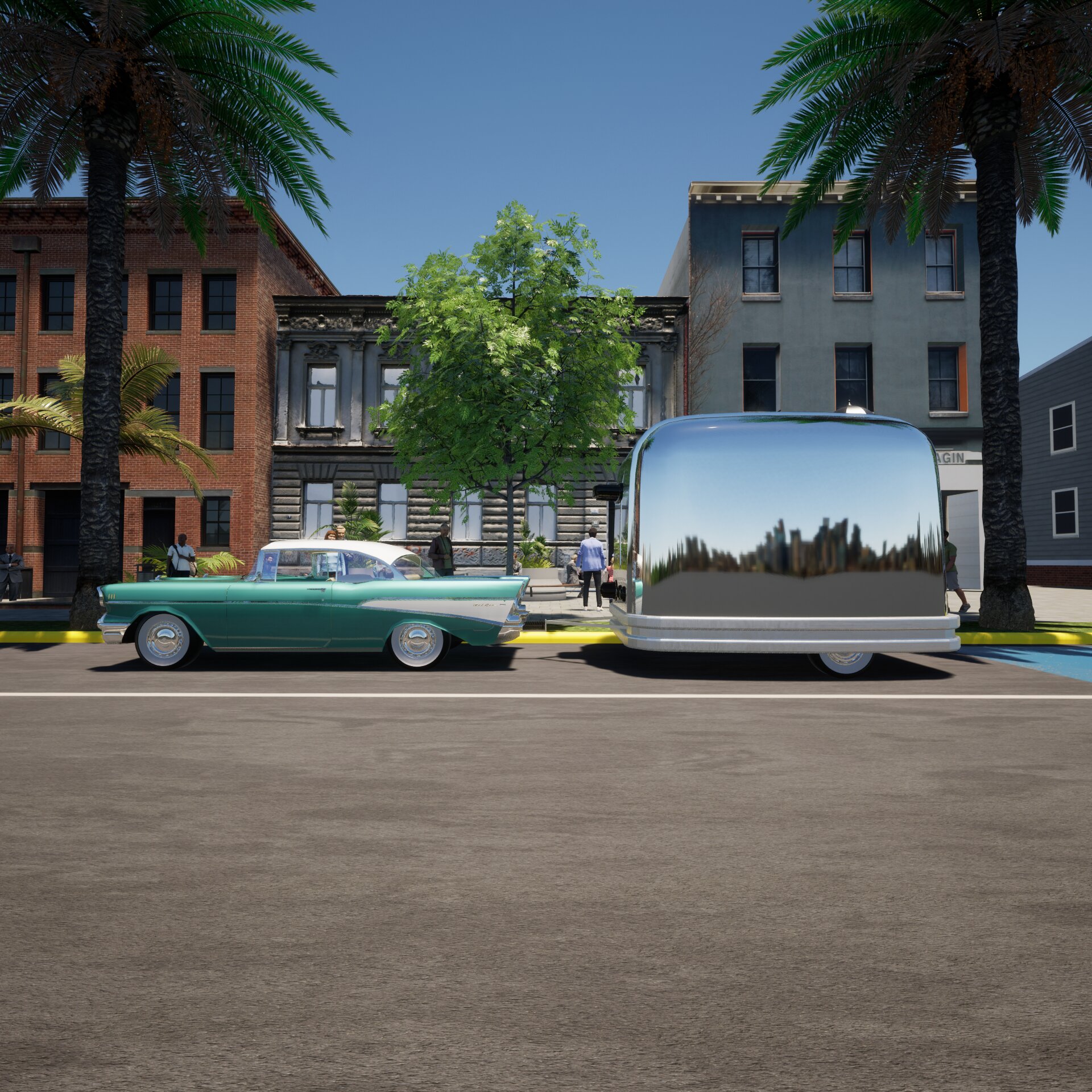 Project: Trailer adapted into the shape of a toaster, towed by a classic car. Parked in an urban setting, on a street with continuous pedestrian flow—emulating several passersby stop to engage with the vehicle. Inside the car’s trunk, multiple toasters are neatly arranged.