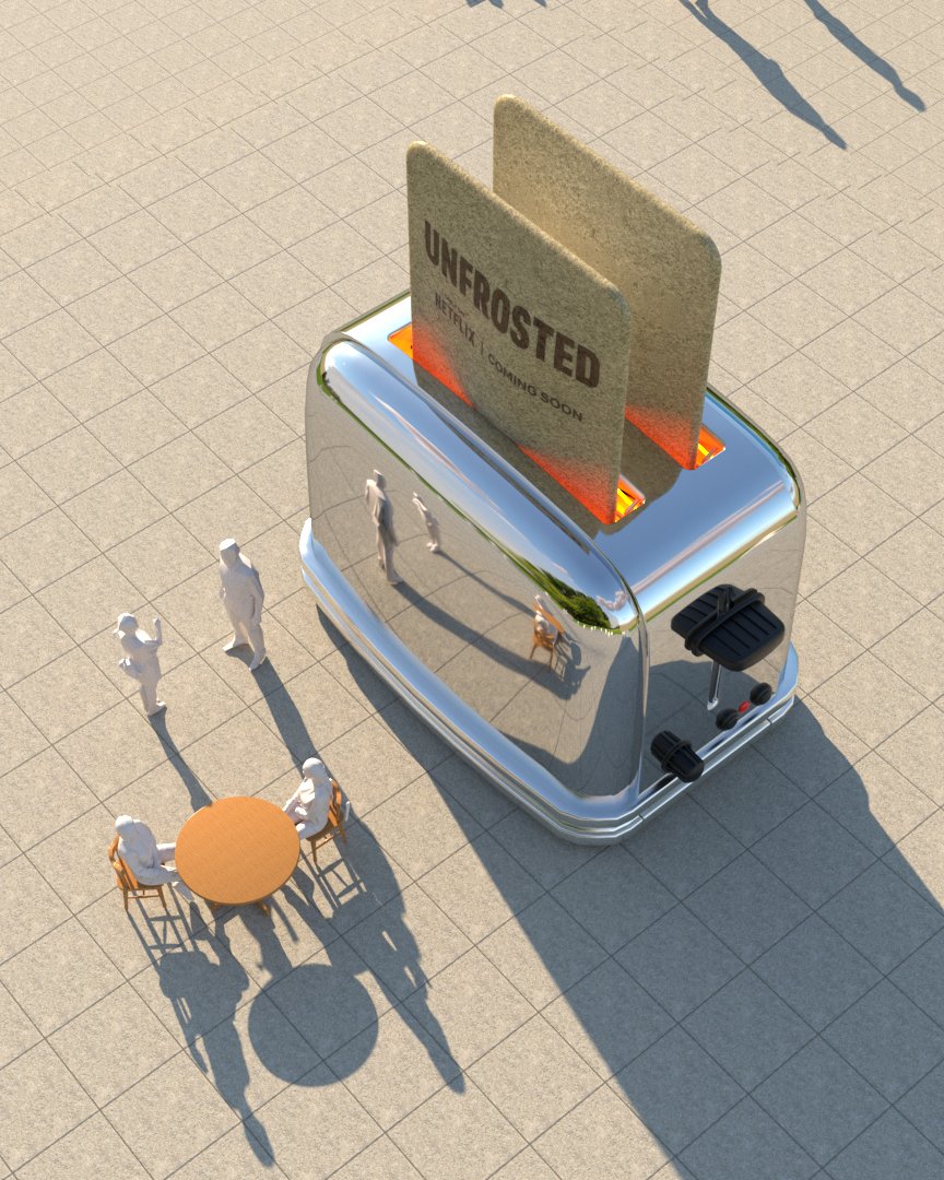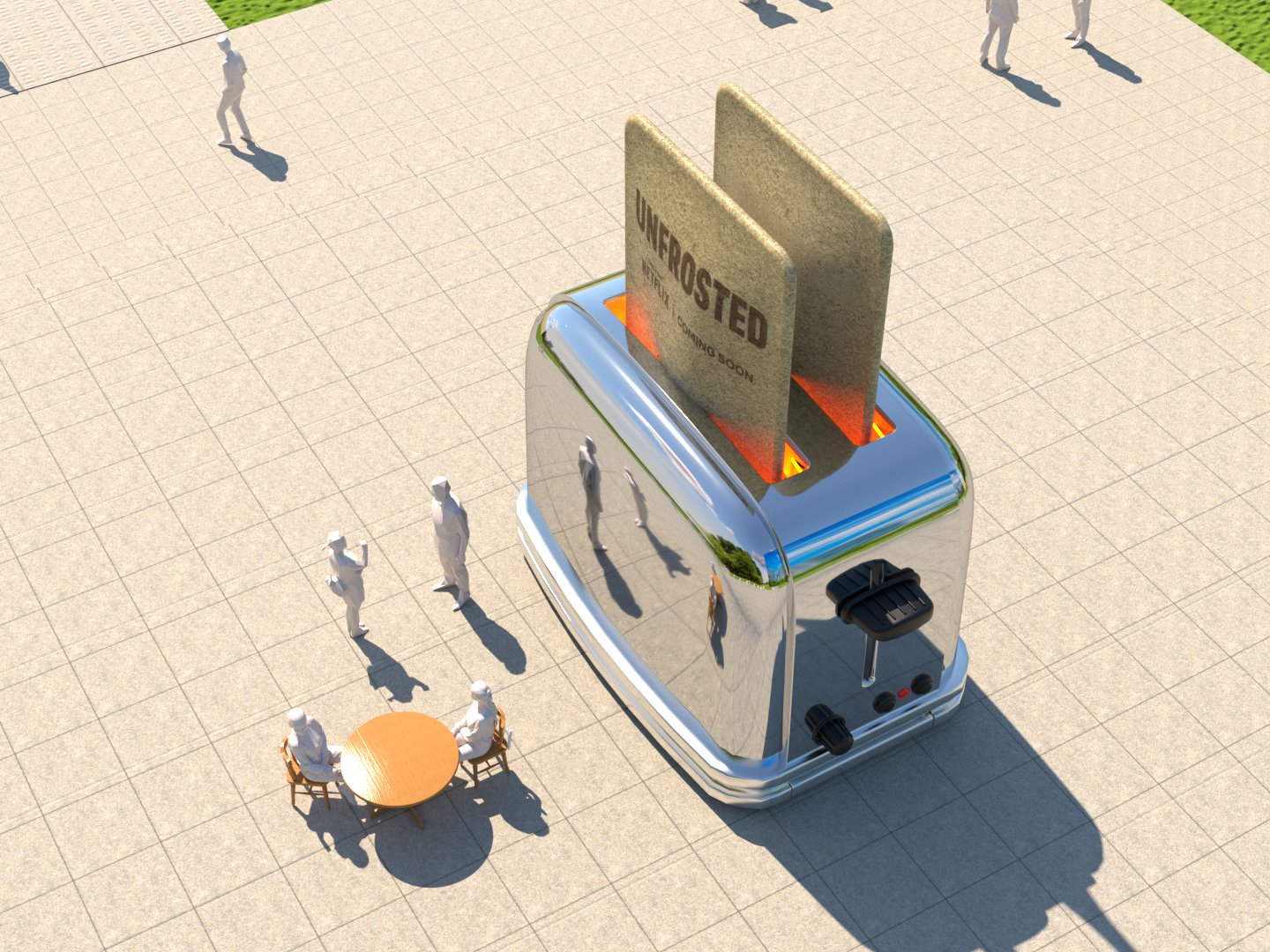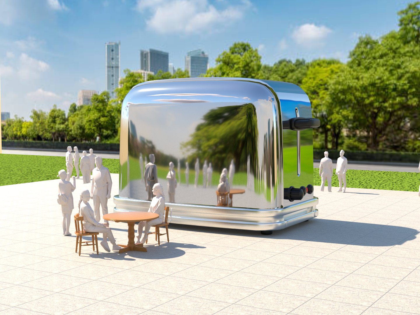 Project: Recreation of a public square featuring a giant toaster as the central focal point. A dining area was placed to one side, and the scene also incorporated the crowding and flow of people throughout the space.