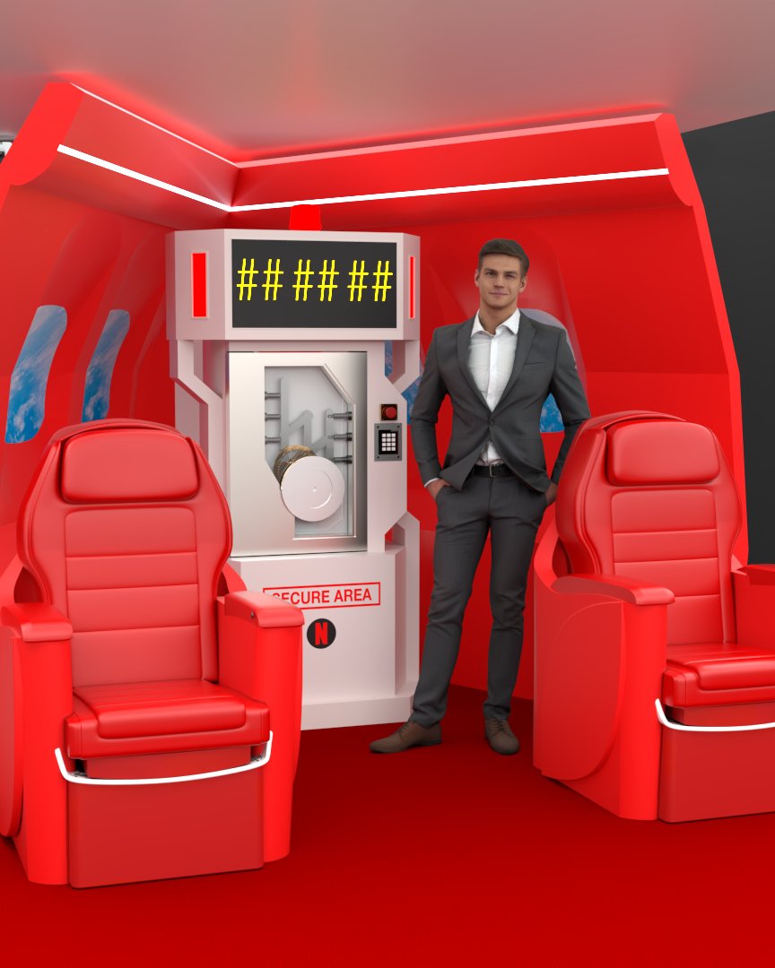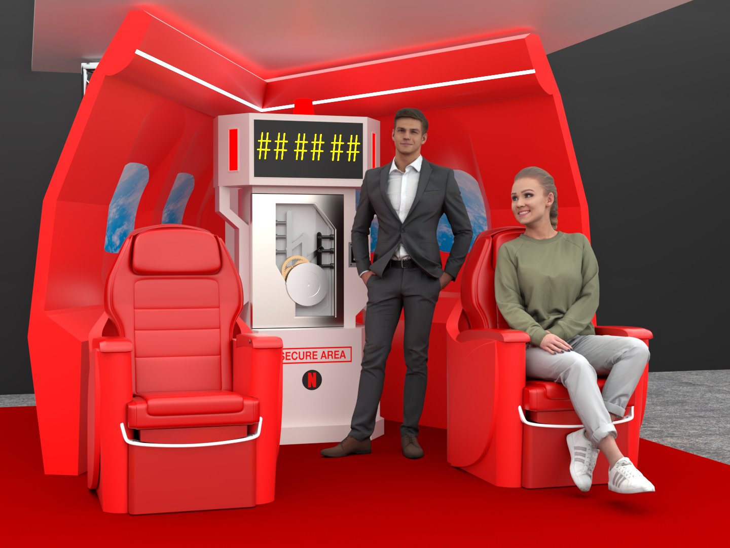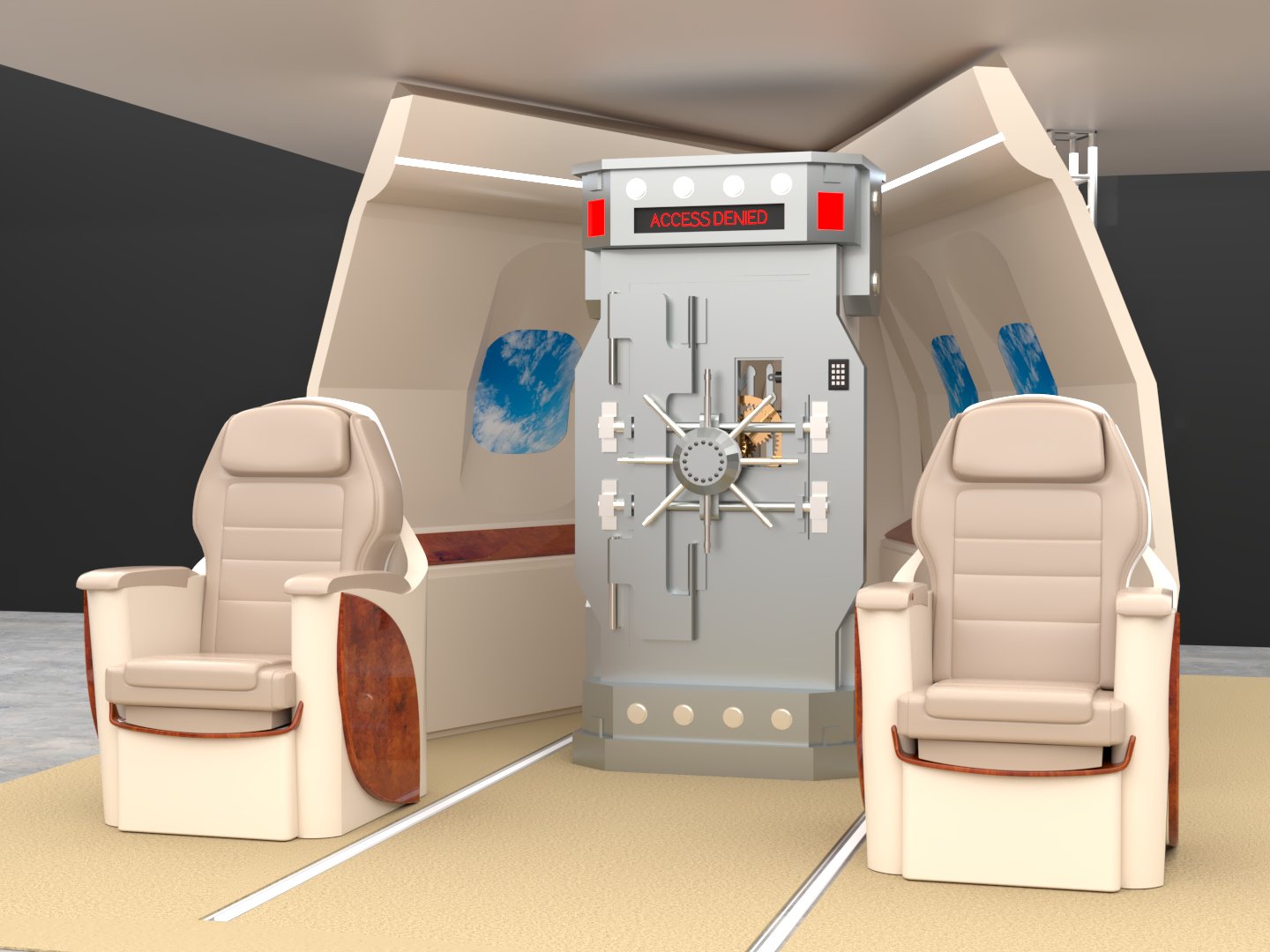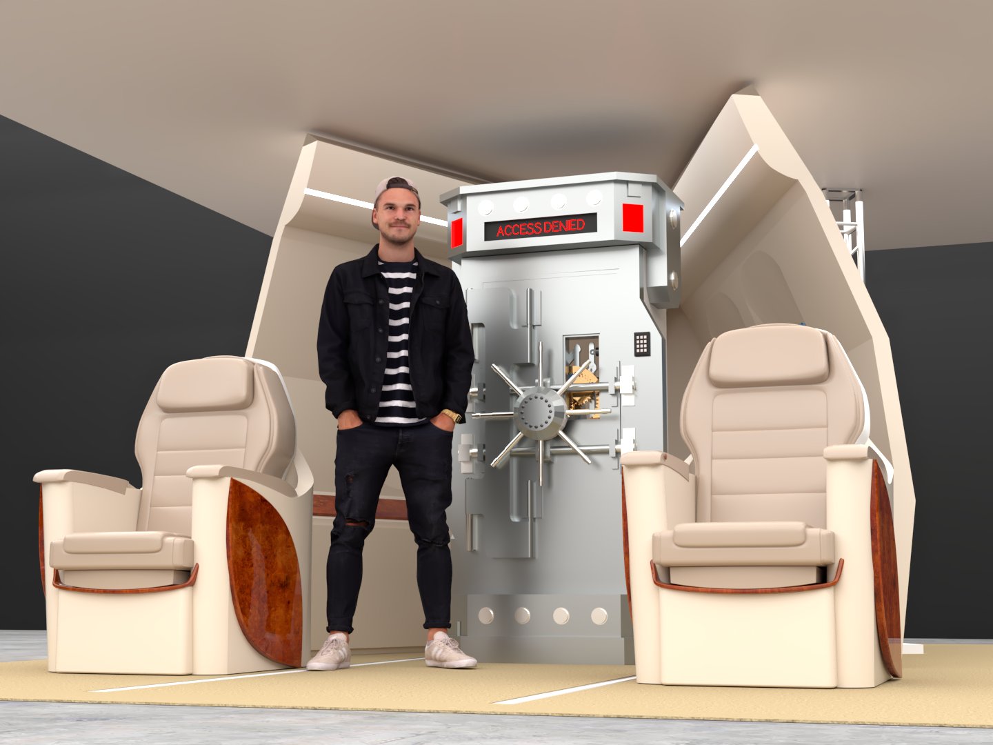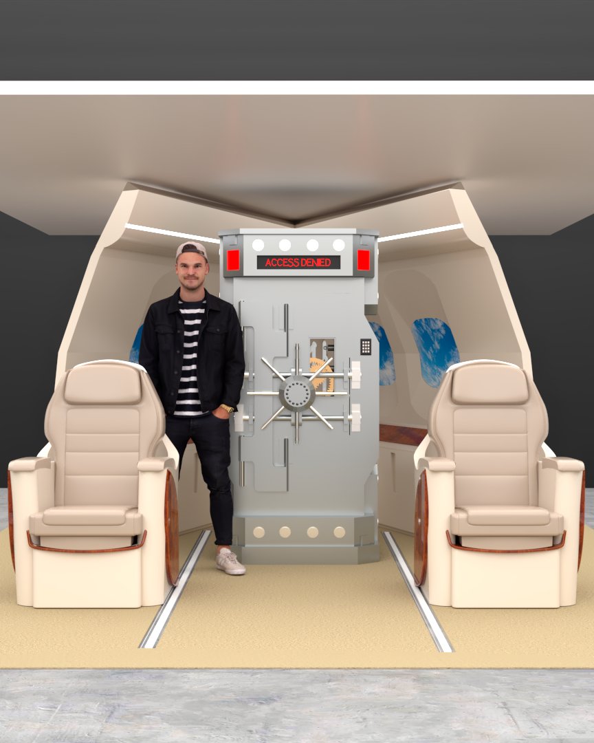 Project: Texturing of a set featuring part of the interior section of a private jet. Two color proposals were developed: a neutral tone (beige) and a vivid one (red). Human figures were added to enhance spatial perception. The seats were 3D modeled in-house.