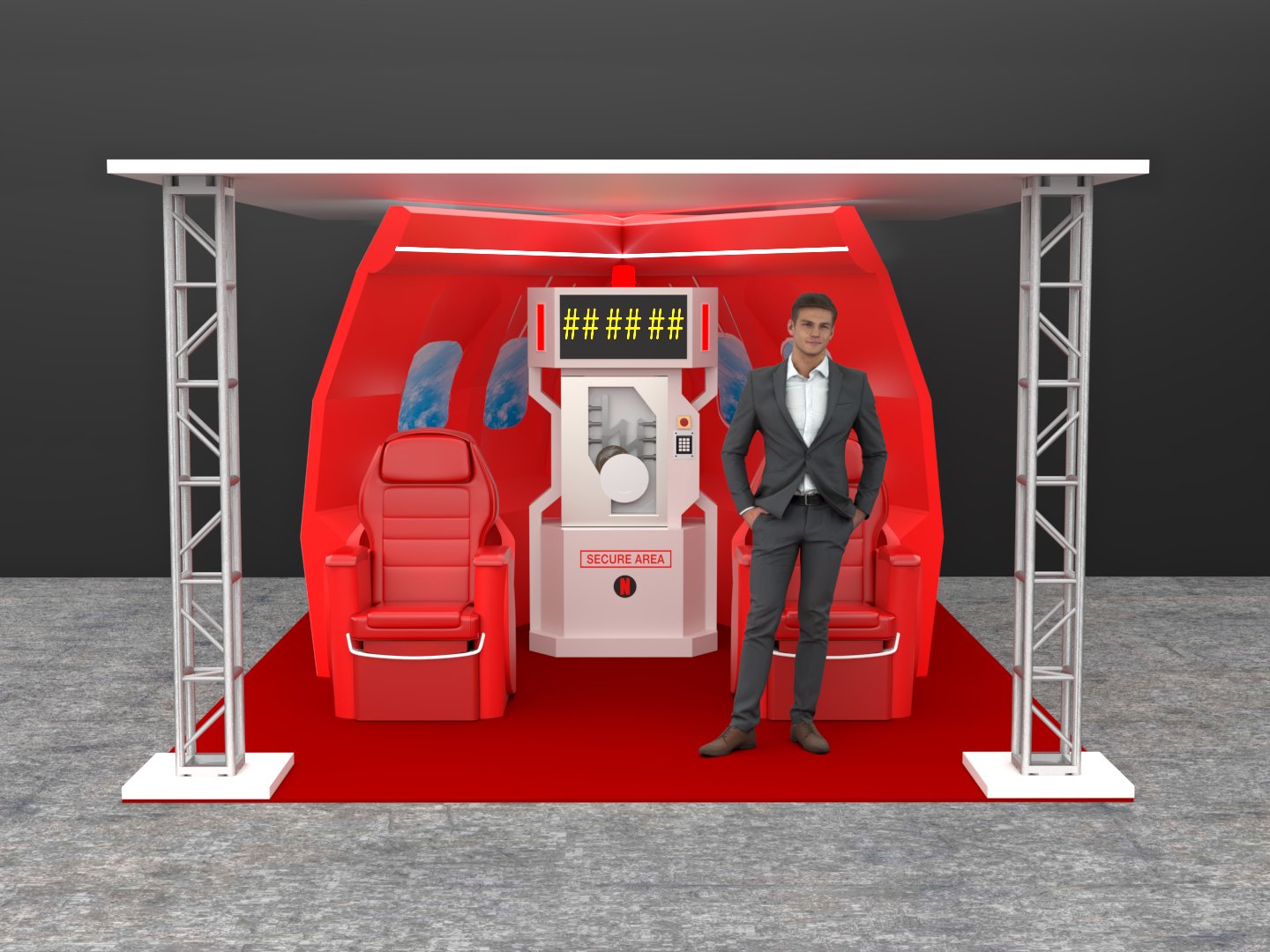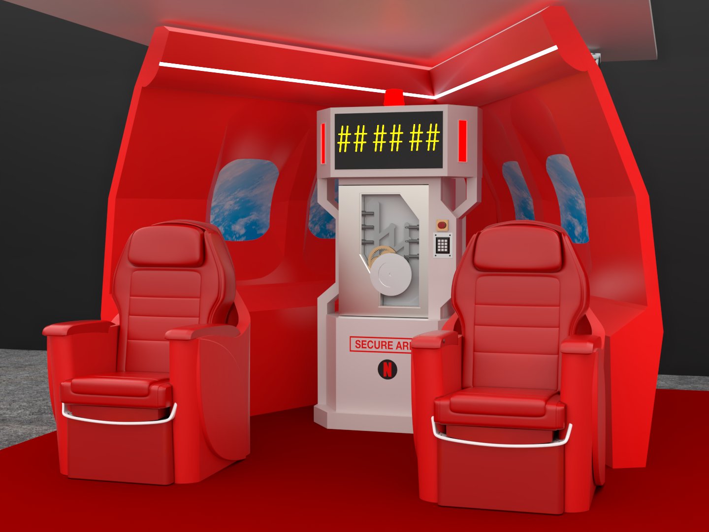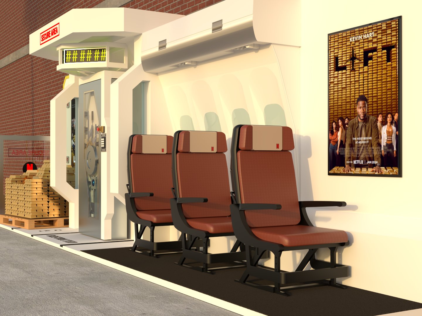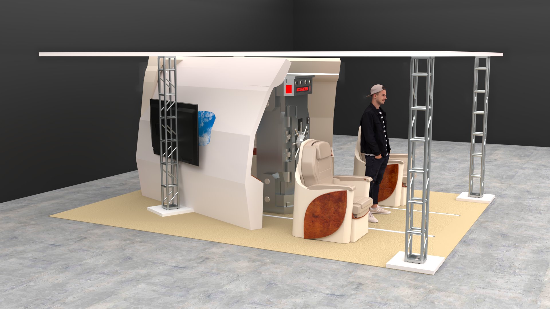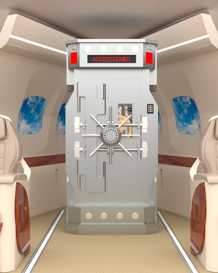 Project: Texturing of a set featuring part of the interior section of a private jet. Two color proposals were developed: a neutral tone (beige) and a vivid one (red). Human figures were added to enhance spatial perception. The seats were 3D modeled in-house.